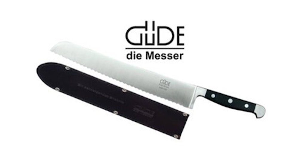 Güde Brotmesser, geschmiedet, Serie Alpha mit Lederscheide Klingenlänge 32 cm Artikelnummer: 1431/32LS Aus einem Stück handgeschmiedete Klinge aus Chrom-Vanadium-Molybdän Messerstahl. Впередverarbeitung in über 30 manuellen Arbeitsgängen. Der feinpolierte Griff besteht aus robustem und pflegeleichtem Hostaform und ist spülmaschinenfest. Rostfrei eisgehärtet, handgeschärft. Die Messer der Alpha-Serie erfüllen die Anforderungen der Richtlinien an Messer für den Einsatz in der Gastronomie und bieten innerhalb der Güde-Serien die größte Modellvielfalt. In diesem Angebot ist eine passende Original Lederscheide von Güde enthalten! Sie haben Ihr Güde Messer nicht in unserem Shop gefunden? Dann melden Sie sich bitte bei uns. Wir können Ihnen weiterhelfen! Ein Güde Messer sollte man sich gönnen.