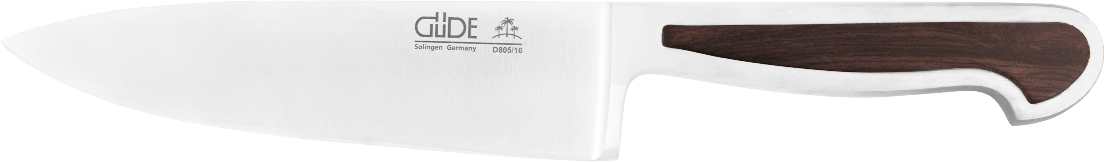 Ein gutes Messer muss scharf sein, scharf bleiben, gut in der Hand liegen und ausbalanciert sein, so dass ermüdungsfreies und jederzeit sicheres Arbeiten garantiert ist. Die Härte des GÜDE Klingenstahls mit ca. 57-58 HRc (Rockwell) und der GÜDE Watenwinkel von ca. 33 Grad stellen eine optimale Schärfe und Schneidhaltigkeit der Serie Delta sicher. Die Form des Griffes aus Ganzmetall mit Intarsien aus Räuchereiche und der für GÜDE typische Doppelkropf garantieren perfekte Handhabung und Ausbalancierung der Messer der Serie Delta.
