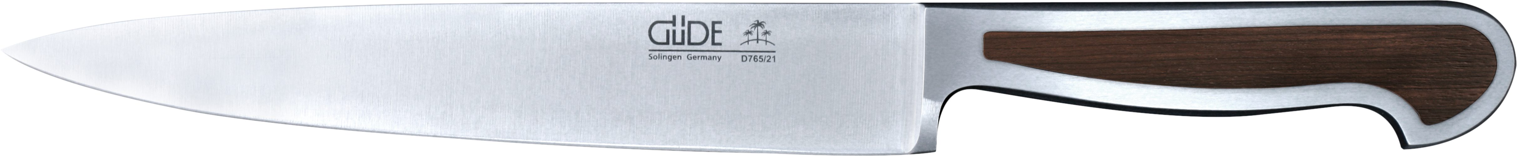 Ein gutes Messer muss scharf sein, scharf bleiben, gut in der Hand liegen und ausbalanciert sein, so dass ermüdungsfreies und jederzeit sicheres Arbeiten garantiert ist. Die Härte des GÜDE Klingenstahls mit ca. 57-58 HRc (Rockwell) und der GÜDE Watenwinkel von ca. 33 Grad stellen eine optimale Schärfe und Schneidhaltigkeit der Serie Delta sicher. Die Form des Griffes aus Ganzmetall mit Intarsien aus Räuchereiche und der für GÜDE typische Doppelkropf garantieren perfekte Handhabung und Ausbalancierung der Messer der Serie Delta.