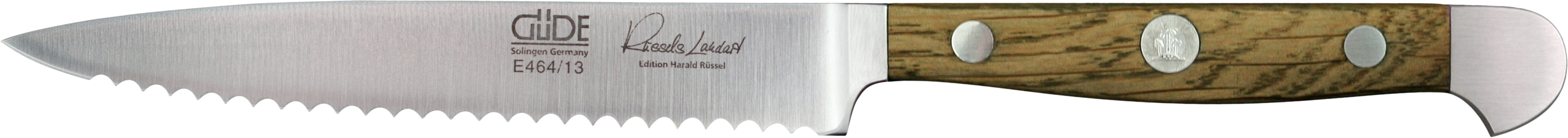 Ein gutes Messer sollte nicht nur scharf sein, es sollte auch möglichst lange scharf bleiben. Ein gutes Messer soll darüber hinaus gut in der Hand liegen und ausbalanciert sein, so dass ermüdungsfreies und jederzeit sicheres Arbeiten garantiert ist. Schärfe und Schneidhaltigkeit der Serie Alpha Fasseiche werden sowohl durch die optimale Härte des GÜDE Klingenstahls mit ca. 57-58 HRc (Rockwell) wie auch durch den GÜDE Watenwinkel von ca. 33 Grad sichergestellt. Die Form des Griffes, der Voll-Erl und der für GÜDE typische Doppelkropf machen aus den Messern der Serie Alpha Fasseiche ein zuverlässiges Werkzeug, das perfekte Handhabung und Ausbalancierung garantiert.