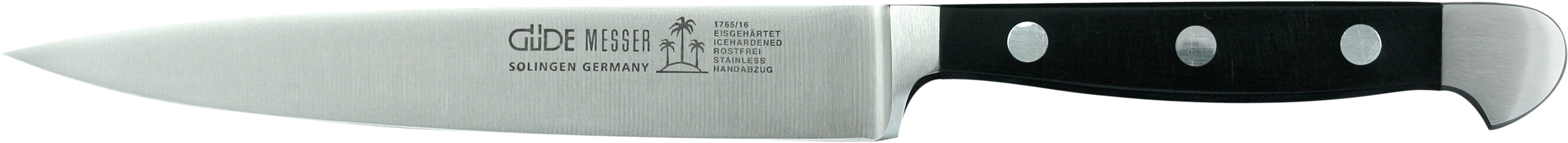 An das Klingenmaterial von Messern sind eine Fülle von Anforderungen zu stellen, die sich zum Teil widersprechen. Also gilt es, ein Optimum zwischen den verschiedenen Anforderungen zu realisieren. So soll ein Messerstahl hart sein, jedoch nicht zu hart, da er ansonsten brechen würde. Er soll aber auch nicht zu weich sein, da das Messer sonst durch Abnutzung zu schnell stumpf werden würde. Daher sind die Messer der Serie Alpha von GÜDE aus einem Chrom- Molybdän-Vanadium-Messerstahl gefertigt, der eine optimale Härte von ca. 57-58 HRc (Rockwell) hat.