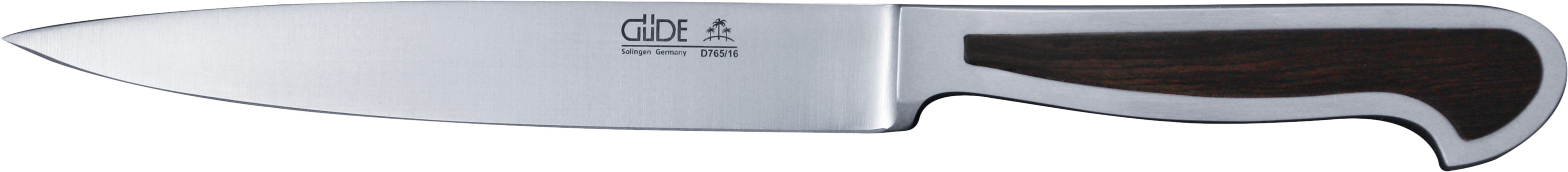 Ein gutes Messer muss scharf sein, scharf bleiben, gut in der Hand liegen und ausbalanciert sein, so dass ermüdungsfreies und jederzeit sicheres Arbeiten garantiert ist. Die Härte des GÜDE Klingenstahls mit ca. 57-58 HRc (Rockwell) und der GÜDE Watenwinkel von ca. 33 Grad stellen eine optimale Schärfe und Schneidhaltigkeit der Serie Delta sicher. Die Form des Griffes aus Ganzmetall mit Intarsien aus Räuchereiche und der für GÜDE typische Doppelkropf garantieren perfekte Handhabung und Ausbalancierung der Messer der Serie Delta.