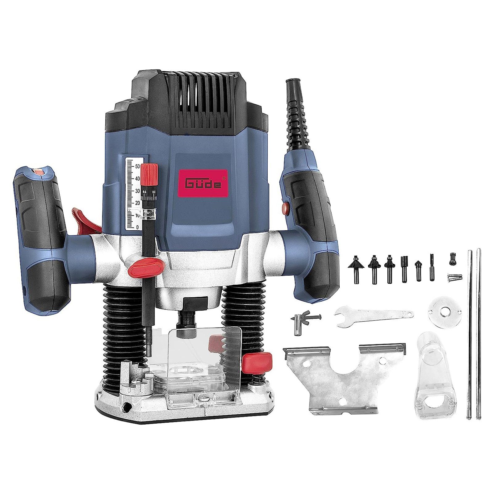 Die Güde Oberfräse OF 1200 E ist ein unverzichtbares Werkzeug für exakte Fräsarbeiten. Durch die 2-Säulen Führung, die Frästiefe-Feineinstellung und dem 7-fach einstellbaren Revolver-Tiefenanschlag erreichen Sie bei Ihrer Arbeit höchste Genauigkeit. Die ergonomischen Handgriffe mit Softgrip Auflage und die Frästiefenarretierung ermöglichen eine sichere und komfortable Bedienung. Die stufenlose Drehzahlregulierung gewährleistet eine materialgerechte Bearbeitung. Ein Sicherheitsschalter mit Einschaltsperre und ein transparenter Späneschutz sorgen für zusätzliche Sicherheit. Die Güde Oberfräse OF 1200 E besitzt einen Anschluss für ein externes Absaugsystem, sodass sie nicht nur exakte, sondern auch saubere Arbeitsergebnisse erzielen können. Die Fräse wird mit zahlreichen Zubehörteilen geliefert (Parallelanschlag, Staubabsaugadapter, Spannzange (6 + 8 mm), Zirkel, Kopierhülse, Schlüssel, 6 Fräsaufsätze).