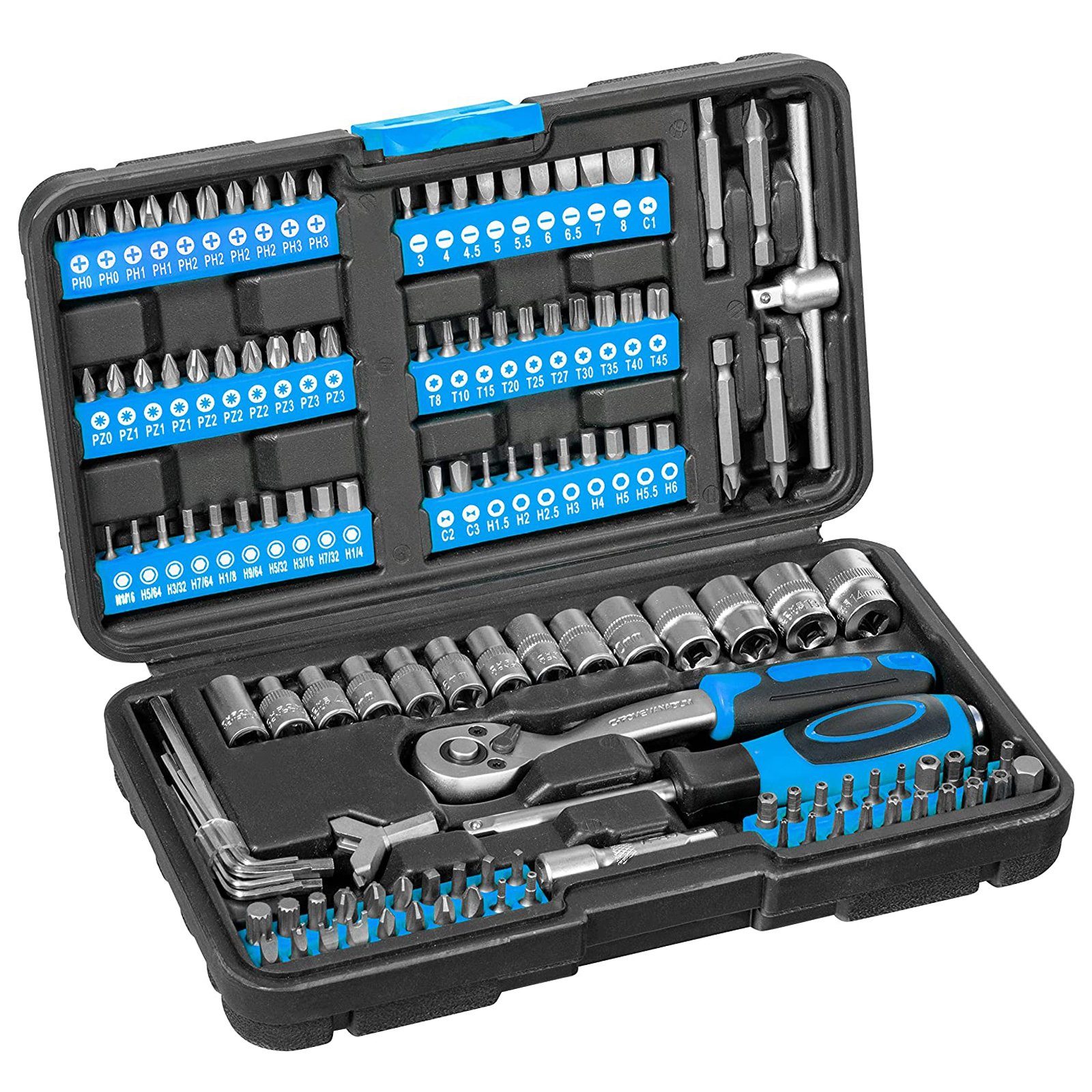 Ein Komplettset 130-teiligem Werkzeugset aus Chrom-Vanadium-Stahl in der praktischen Aufbewahrungsbox.