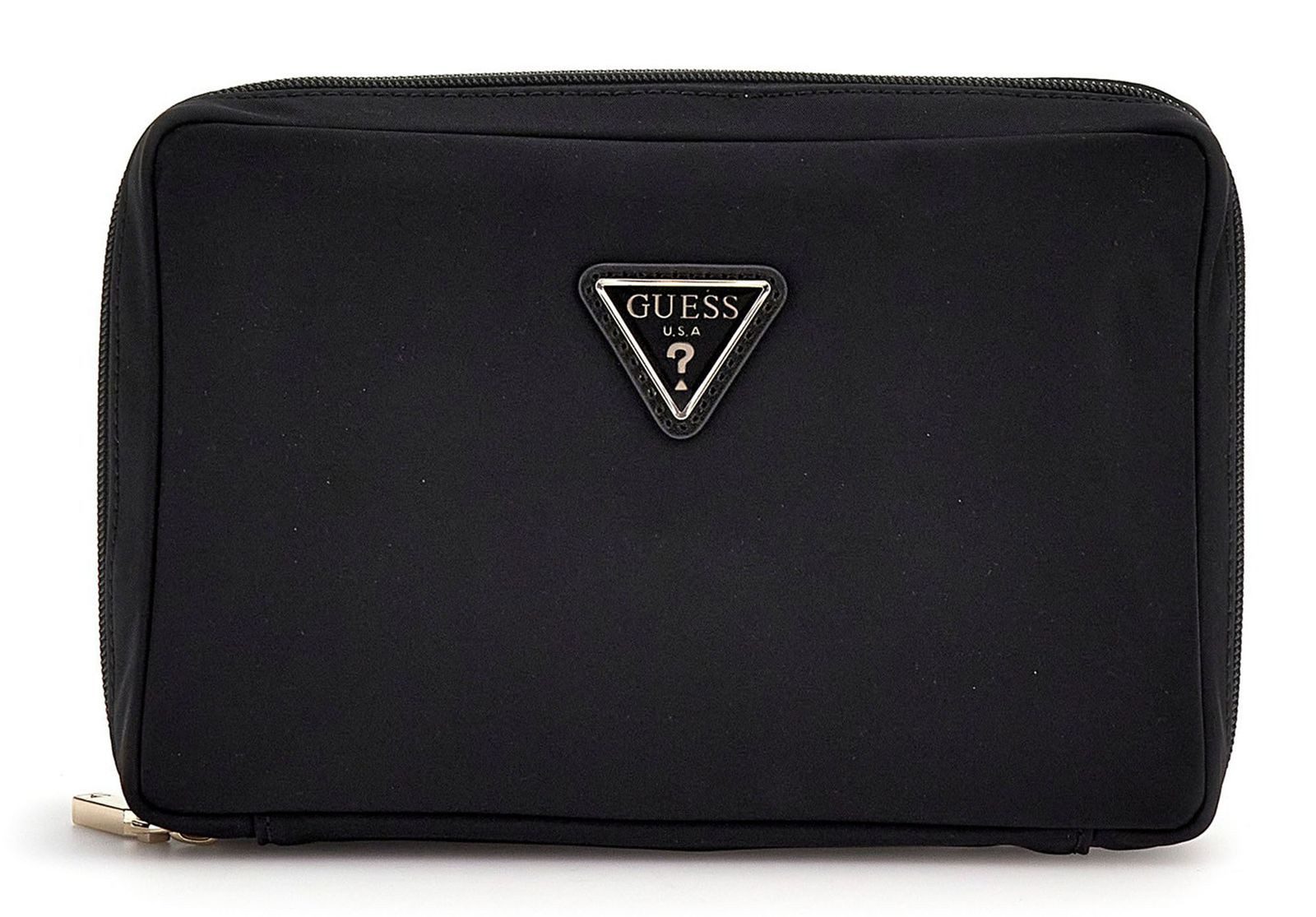 Im Alltag oder auf Reisen - diese Kosmetiktasche mit Kulturbeutel wird Sie begeistern! In ihrer praktischen Form finden Kosmetik-, Hautpflegeartikel oder Ähnliches einen Aufbewahrungsplatz. Im Inneren kommt alles strukturiert unter. Als besonders modischer Begleiter können Sie sich bei der GUESS Kosmetiktasche auf die Kombination von Pragmatik und edlem Design freuen. Die Kosmetiktasche kann an dem Haken leicht in jedem Badezimmer aufgehängt werden. Lassen Sie sich von dem GUESS Follie Travel Hanging Organizer Case bei Ihrer nächsten Reise überzeugen!