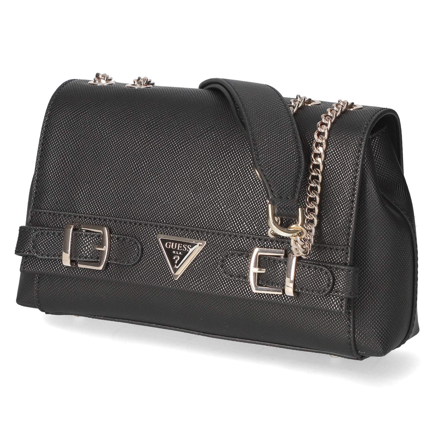 Entdecken Sie die elegante Guess Damen Umhängetasche FLAP LEVANTE in Schwarz aus hochwertigem Kunstleder. Diese stilvolle Tasche verfügt über einen Schultergurt mit Kettenelementen und glänzende Metallelemente in goldener Optik, die ihr einen luxuriösen Touch verleihen. Der Überschlag mit Magnetverschluss sorgt für sicheren Halt und eine einfache Handhabung.