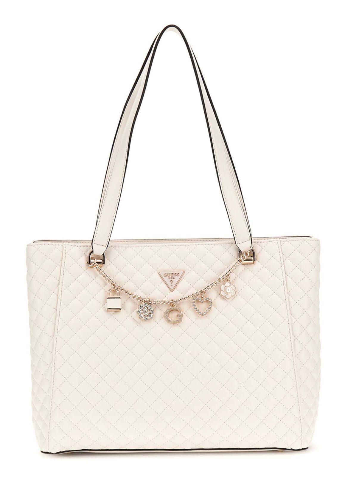Diese GUESS Everlee Noel Tote Bag Schultertasche verschönert ihnen mit ihrem einzigartigen Design den Tag. Sie ergänzt jeden Look perfekt und wird viele neidische Blicke auf sich ziehen. Im Inneren haben Sie genug Stauraum für all Ihre Wertgegenstände und behalten dank der praktischen Aufteilung und einer Trennung in zwei Hauptfächer den perfekten Überblick. Die Noel Tote Bag garantiert angenehmen Tragekomfort an ihren zwei Henkeln.