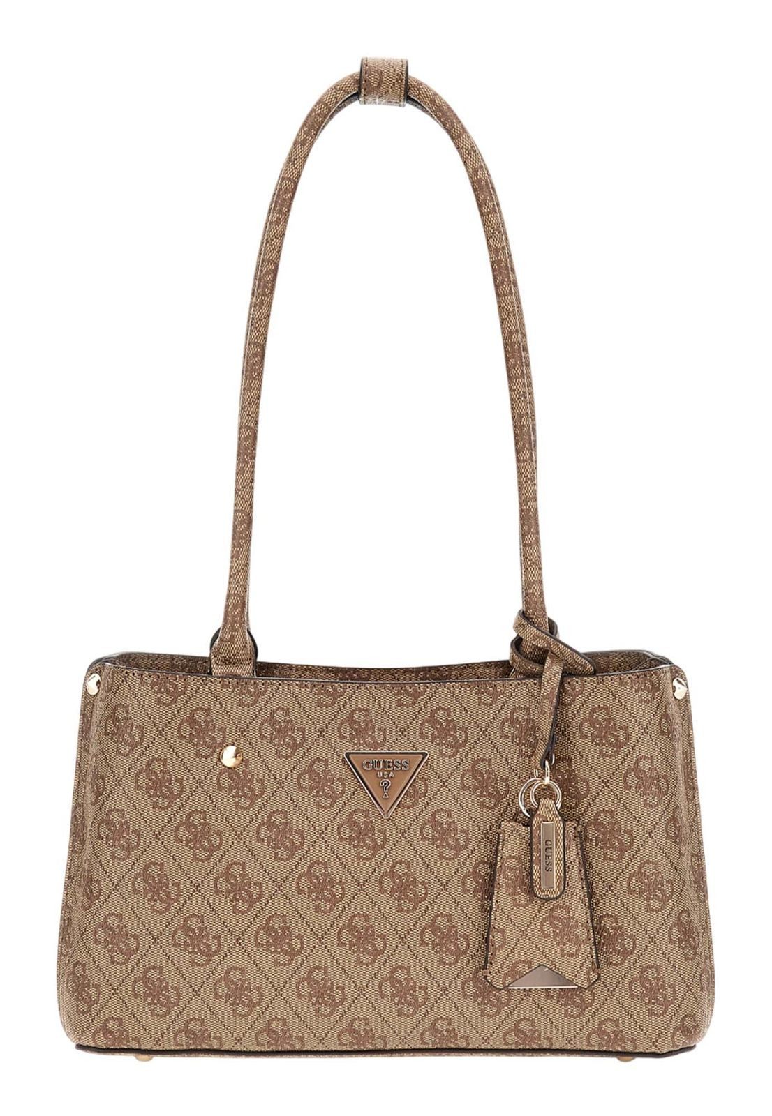 Die Marke GUESS hat mit der Meridian Shoulder Satchel Bag etwas Besonderes geschaffen. Die GUESS Schultertasche wird Ihren Outfits einen eleganten Schliff verleihen. Das markante Logo Muster und die Nieten-Applikationen setzten die Tasche stylisch in Szene. Vornehm können Sie die Shoulder Satchel Bag auf der Schulter tragen und dabei kommt die luxuriöse Form optimal zur Geltung. Haben Sie mit dieser Tasche Ihre Habseligkeiten immer stylisch an Ihrer Seite!