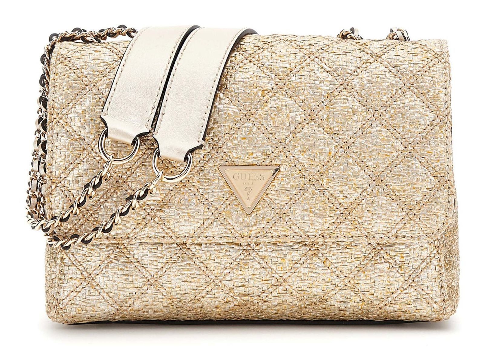 Die GUESS Umhängetasche begeistert mit modischem Design, toller Form und durchdachtem Innenleben. Stylische Eleganz lässt die schicke GUESS Giully II Two Compound Convertible Flap Bag zu einem wahren Blickfang werden. Die Bast Optik und die eingearbeiteten goldfarbenen Fäden machen diese Umhängetasche zu einem erstklassigen Accessoire für jeden Anlass. Zudem kommen im Inneren der GUESS Umhängetasche Lippenstift, Schlüssel, Handy und Co. problemlos unter. Lassen Sie sich das nicht entgehen!