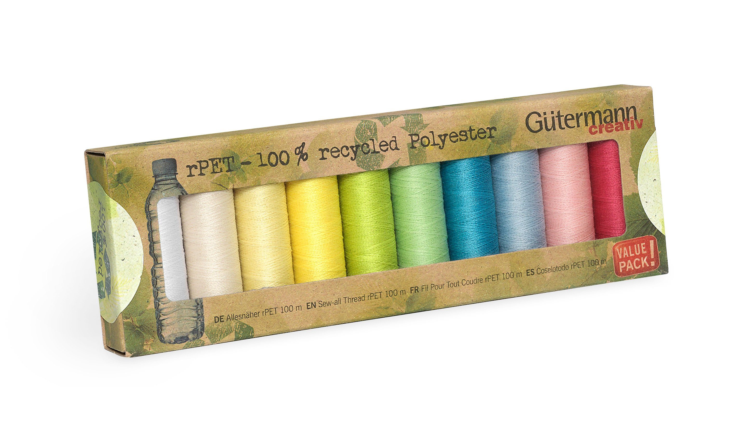 Das wunderschöne Nähgarn-Set Всеsnäher rPET von Gütermann ist aus 100 % recyceltem Polyester gefertigt. Das Set beinhaltet 10 x 100 m Nähgarn in den Farben Weiß, Puder, Hellgelb, Gelb, Hellgrün, Blassgrün, Blau, Hellblau, Rosa und Rot. Ein tolles Garn für viele Nähprojekte mit bunten Stoffen. Passend für alle handelsüblichen Nähmaschinen.