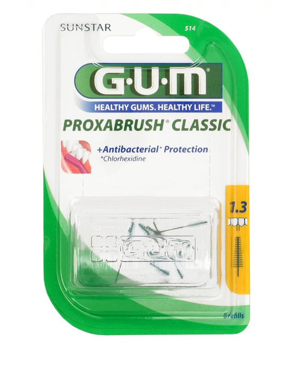 Die Interdentalbürsten haben einen nylonummantelten Draht. Die Borsten der Interdentalbürste sind mit Chlorhexidin beschichtet und gewähleisten so einen antibakteriellen Schutz. Eine Packung enthält 8 Stück - gelb 1,3mm Tanne. Passend für den Halter Gum Proxabrush Classic oder für den Universalhalter aus Aluminium.