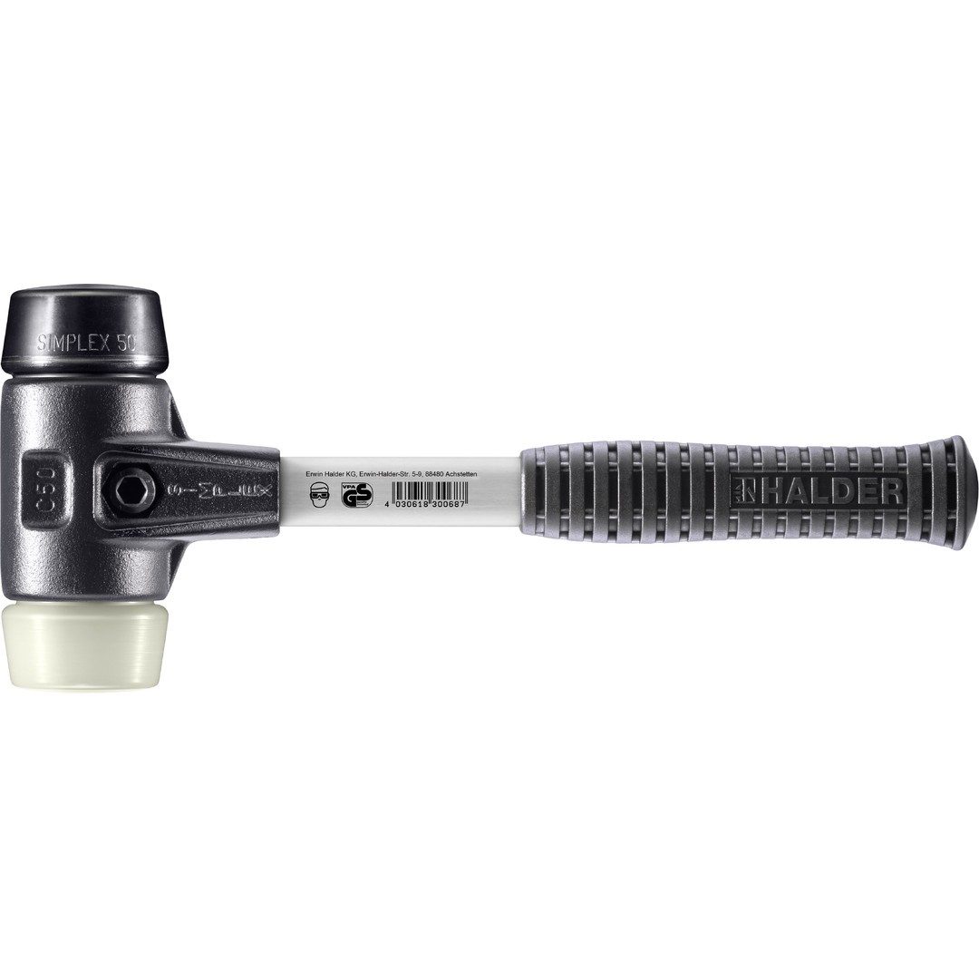 SIMPLEX–Schonhammer in der Einsatzkombination Gummikomposition (schwarz, mittelhart, dämpfend, geruchsneutral, verschleißarm) / Nylon (weiß, hart, sehr verschleißfest, kein Absplittern auch bei Minustemperaturen, öl- und fettbeständig).