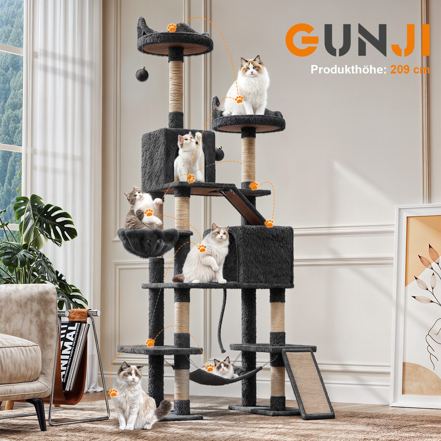 Der Kratzbaum wird mit 2 gemütlichen Sitzstangen, 2 gemütlichen Katzenhöhlen, einer flauschigen Hängematte und einem gut gestützten Korb geliefert. Jede Katze findet auf diesem mehrstöckigen Kratzbaum einen Lieblingsplatz, ideal für Familien mit mehreren Katzen.