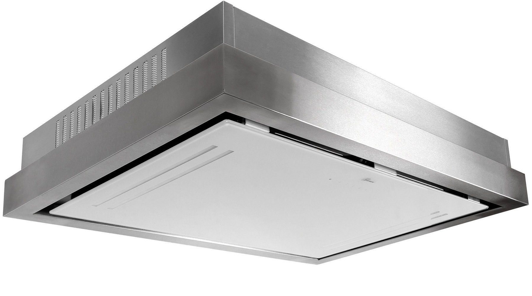 Luxus Umluft Deckenhaube mit Ionisierung in Edelstahl/ Weiß Glas Ausführung.
