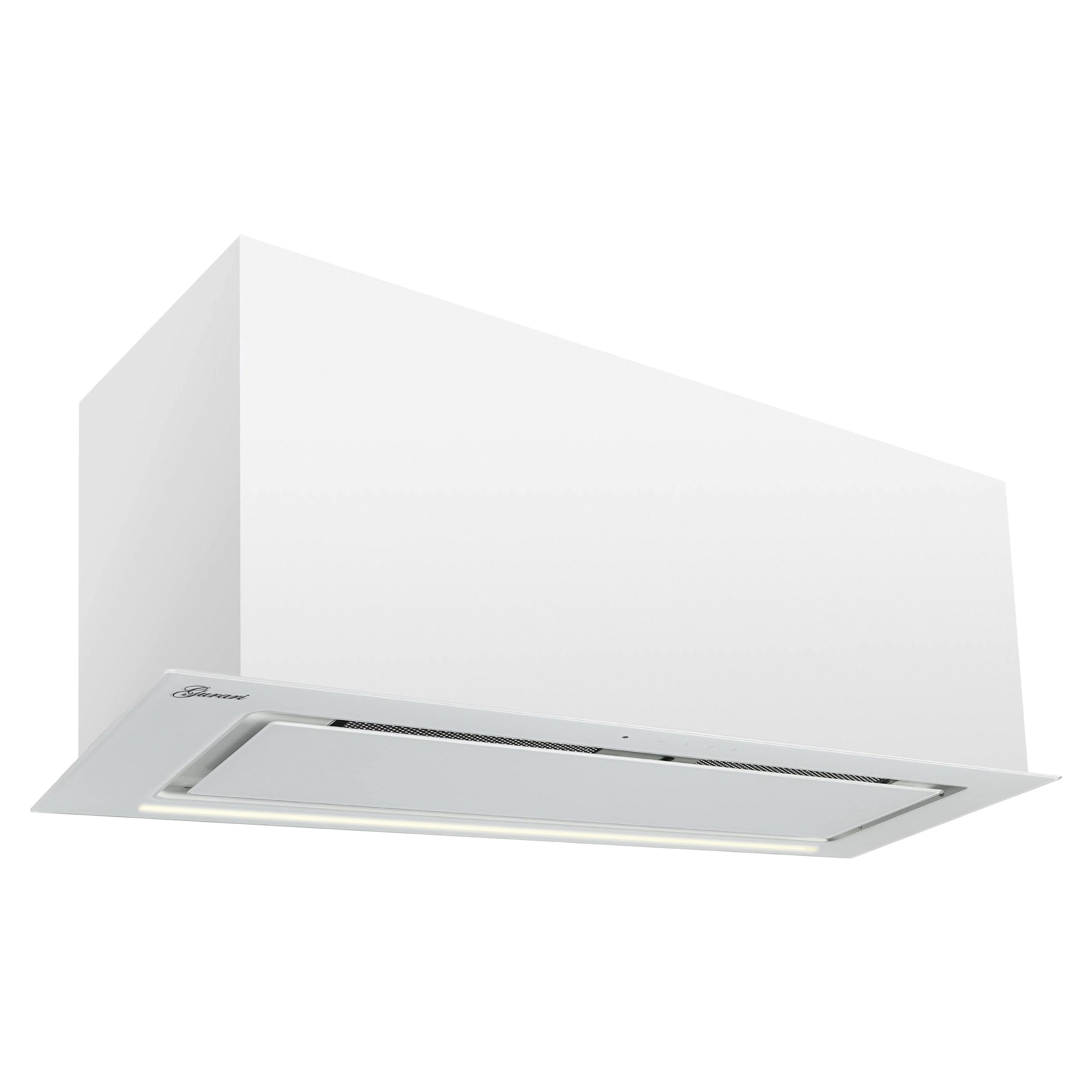 Rahmen und Innenplatte sind weiß in Weiß Glas gehalten. Zwei 3 Watt LED Streifen sorgen für optimale Beleuchtung der Kochfläche. Im äußeren Rahmen ist das Bedienfeld eingearbeitet. Die verschiedenen Funktionen der Dunstabzugshaube (Licht, Stufenregulierung und Timer ) können dort über die “Touch Control” Steuerung oder die im Lieferumfang enthaltene Fernbedienung gesteuert werden.