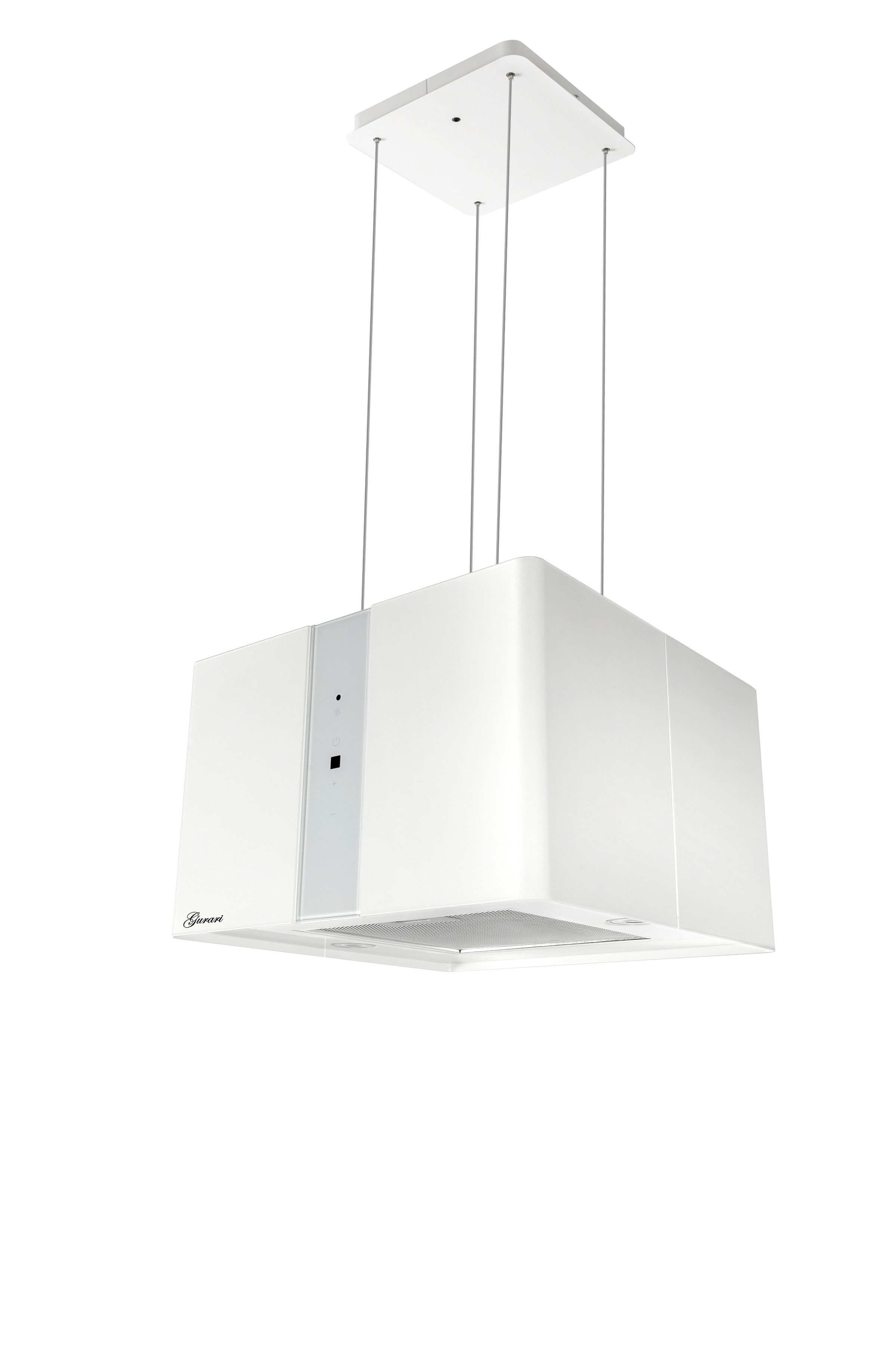 Die an 4 Seilen abgehängte Umluft Inselhaube GCH I 331 BL PRIME N ist komplett in Weiß gehalten. Auf der Vorderseite befindet sich eine 4-stufige (+ Turbo) “Touch Control” Steuerung.