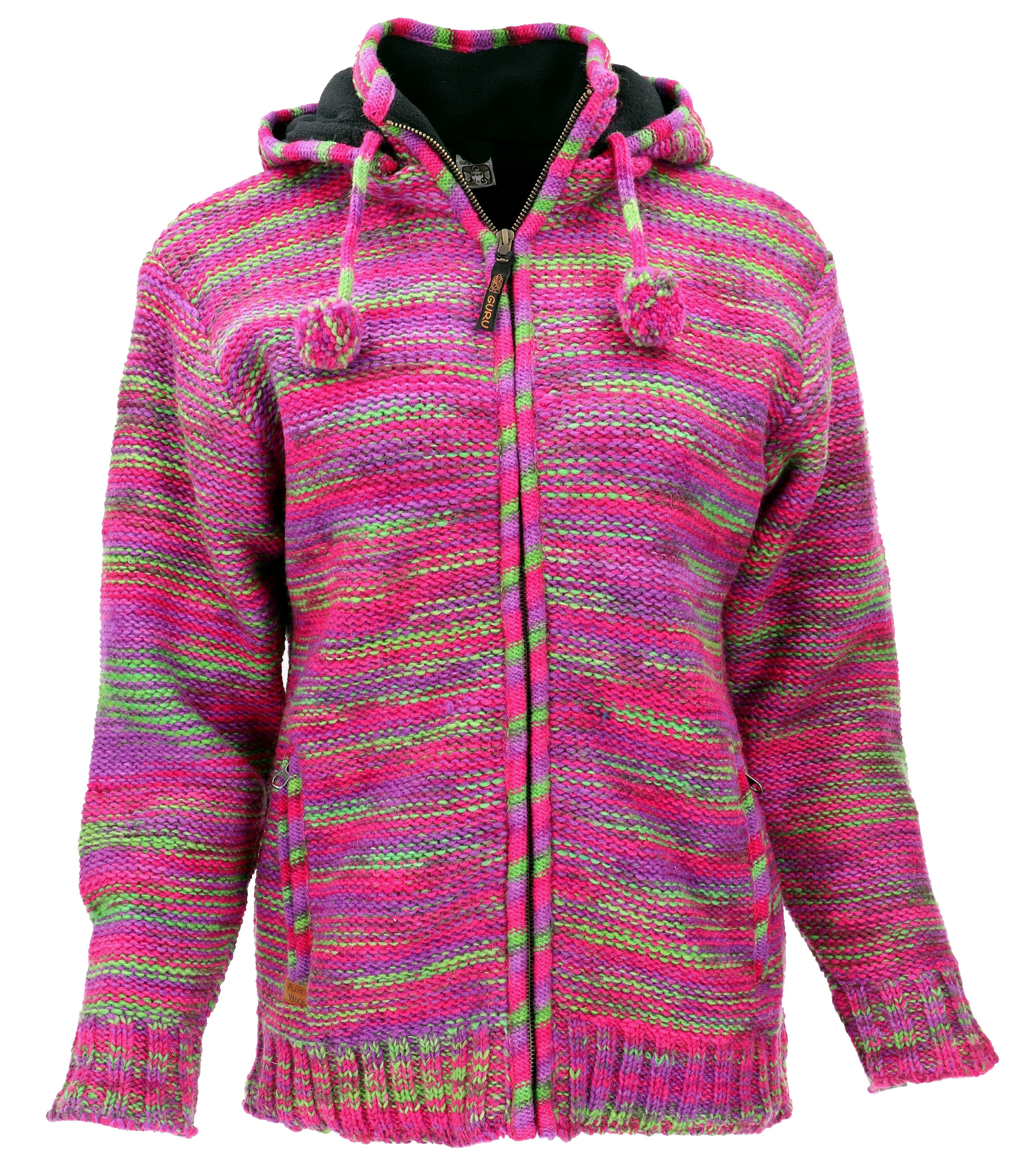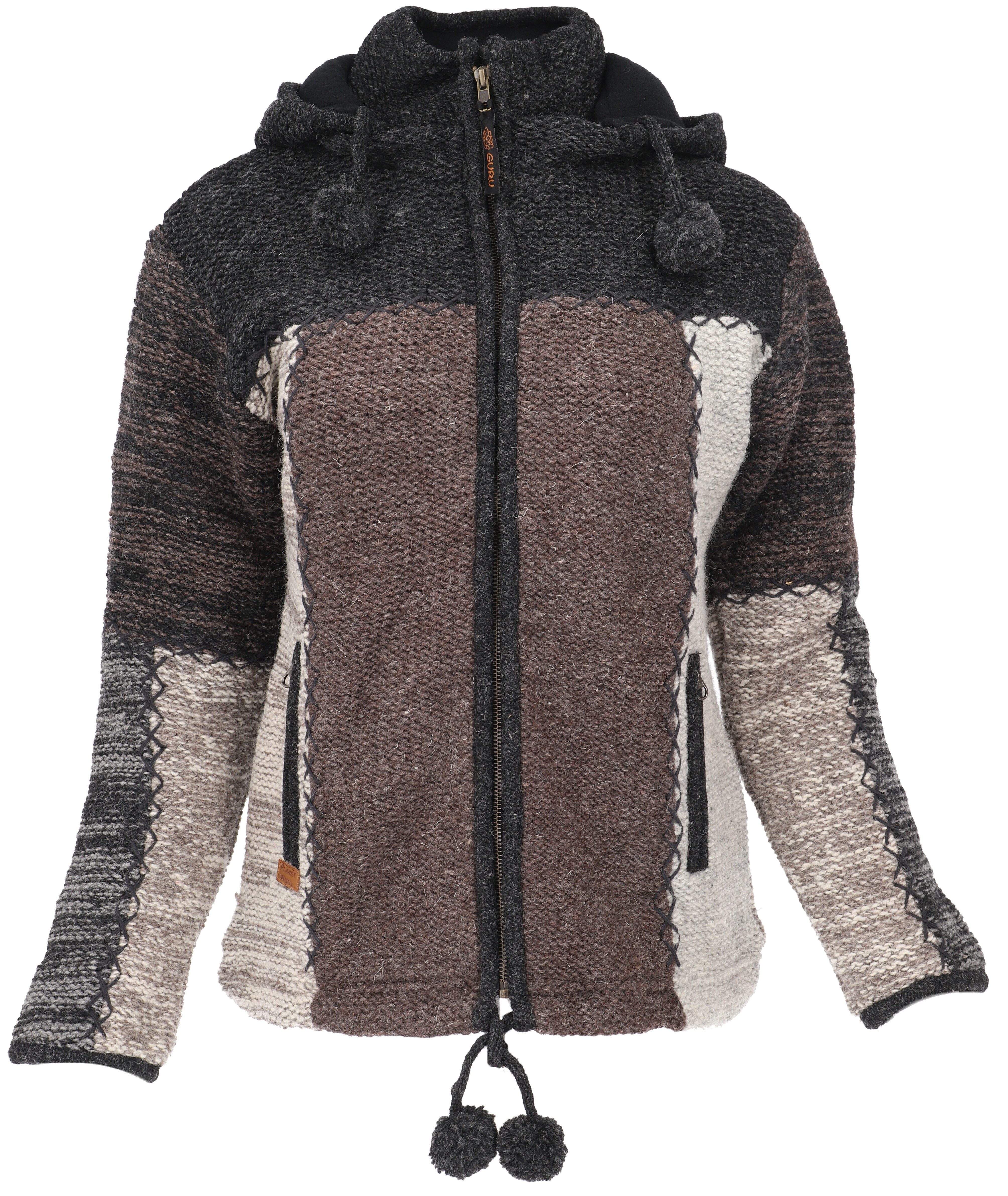 Mit Fleece gefütterte Strickjacke mit Kapuze aus reiner Schafwolle. Mollig warm mit geräumigen Taschen. Die schöne Winterjacke hat einen Reißverschluss. Die Kapuze kann nach Belieben abgenommen werden. Die seitlichen Außentaschen haben, genau wie die Kapuze, Reißverschlüsse. Auch im Innenfutter befindet sich eine Tasche mit Reißverschluss. Die Jacke vereint die guten Eigenschaften reiner Schafwolle mit der komfortablen Eigenschaft von Plyfleece. Sie ist sowohl feuchtigkeitsabweisend, Dank des in der Wolle enthaltenen Wollfetts, als auch kuschelig weich. Durch die doppelte Schicht weist sie auch kalten Wind ab. Die Jacke wurde mit Handstrickmaschine in Nepal mit Sorgfalt gefertigt. Jede Jacke ist ein unverwechselbares Unikat und kann im Farbverlauf leicht von der Abbildung abweichen.