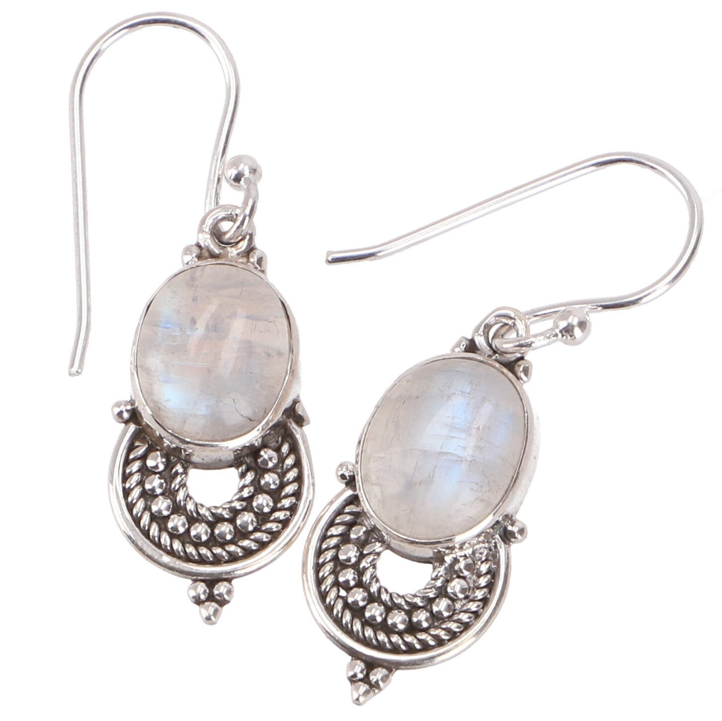 Indische Silberohrringe, Ethno Ohrringe, Boho Ornament Ohrhänger - Mondstein | 2,5*0,8 cm