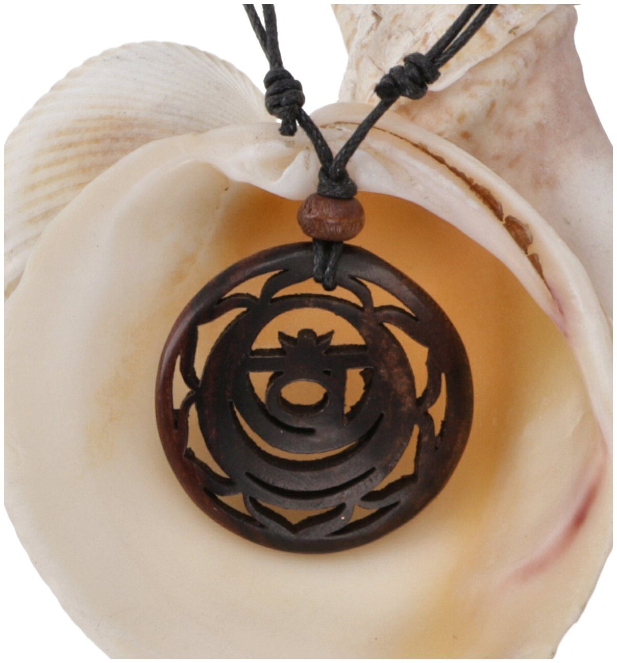 Wunderschönes, von Hand gefertigtes Chakra Amulett aus dunklem Sonoholz mit der Symbolik des Sakralchakras.