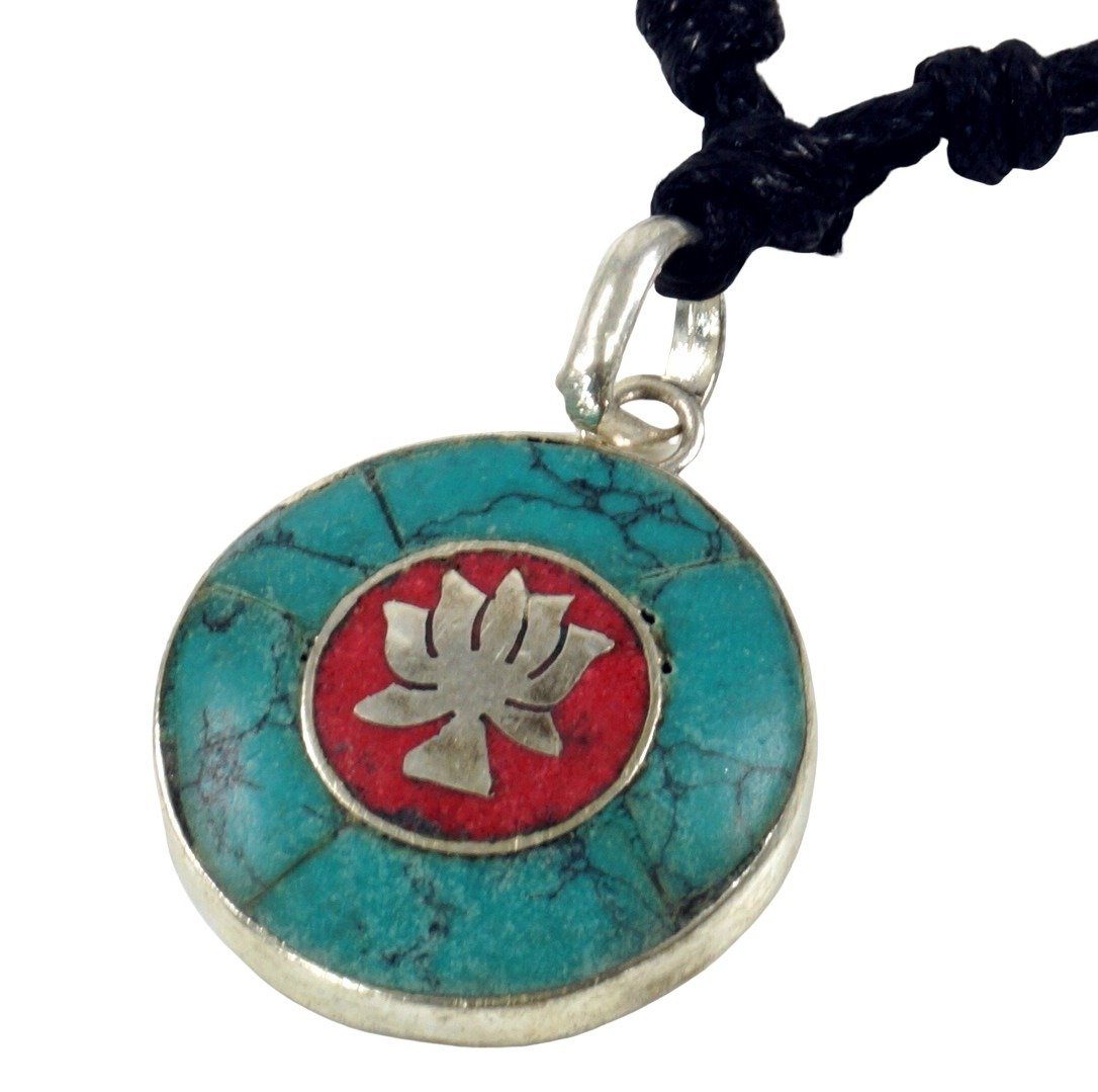 Tibetkette, Nepalschmuck, Amulett Türkis Lotus - Modell 4, Ø 2 cm
