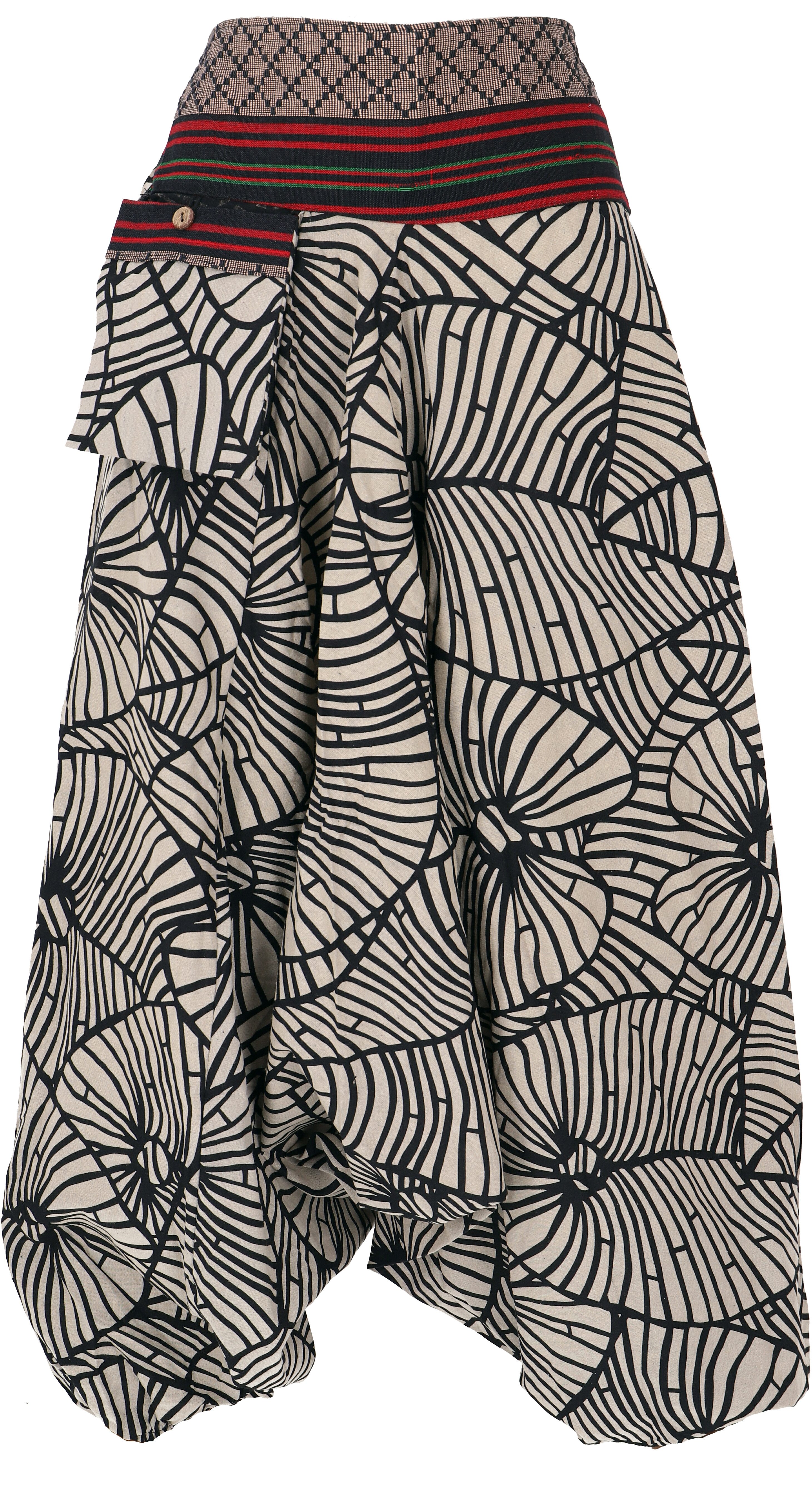 Die bedruckte Pluderhose, ist ein absoluter Hingucker. Die leichte und luftige Sommerhose ist mit einem wunderschönen Muster und sorgt für einen exotischen Look. Der breite gewebte Bund sorgt nicht nur für einen bequemen Sitz, sondern verleiht der Hose auch einen besonderen Touch. Die Hose ist am Bund rückseitig und an den Beinen elastisch, wodurch sie sich perfekt an die Körperform anpasst. Die vordere, mit einem Knopf verschließbare Tasche, bietet Platz für kleine Gegenstände. Sie eignet sich perfekt für alternative Bekleidungsstile und ist ein Must-Have für alle, die den Ethno Style lieben. Die Hose ist aus 100% Baumwolle gefertigt und fühlt sich angenehm auf der Haut an. Der perfekte Begleiter für warme Tage. Das Material des Bundes ist traditionell gewebt und kann leicht von der Abbildung abweichen.