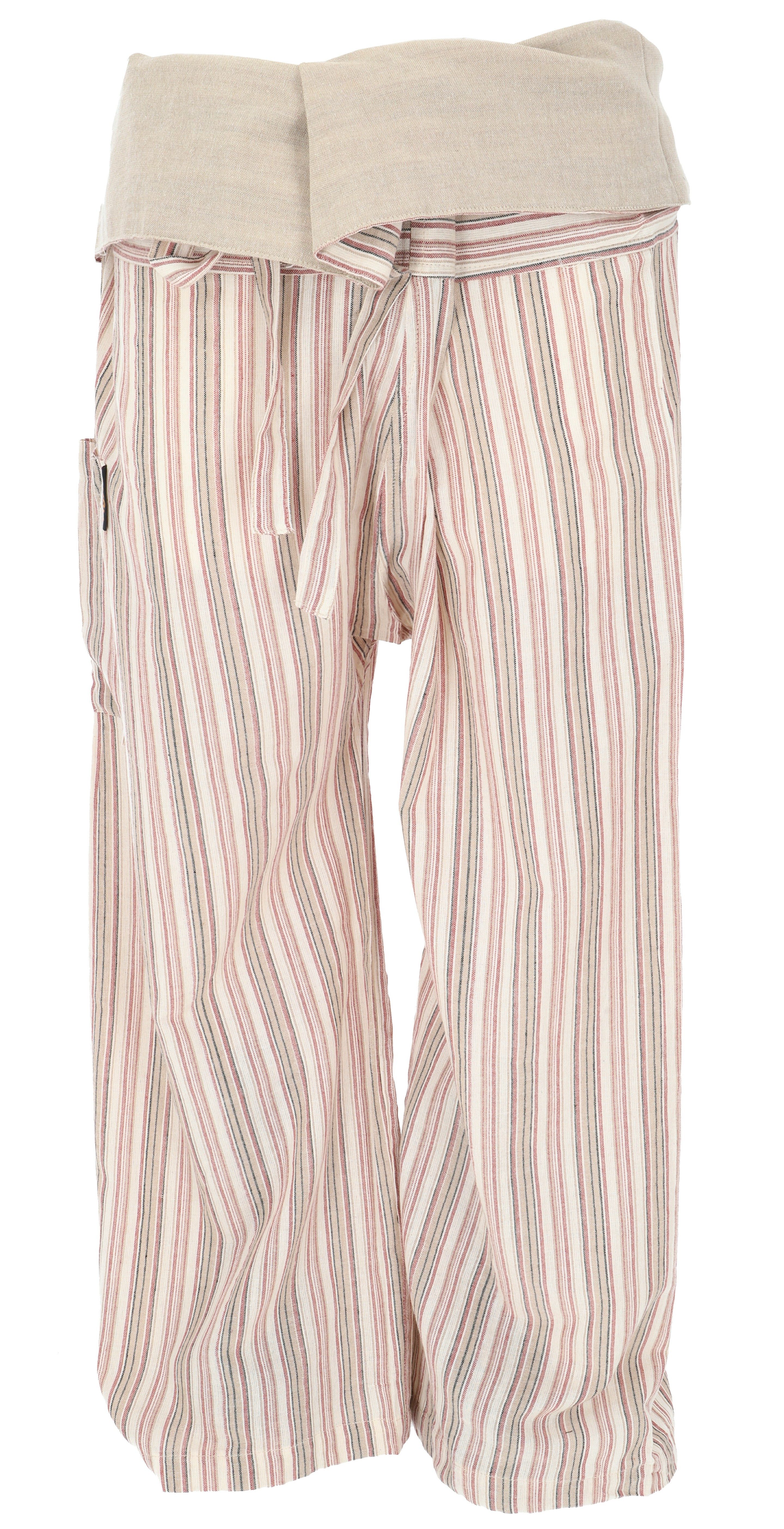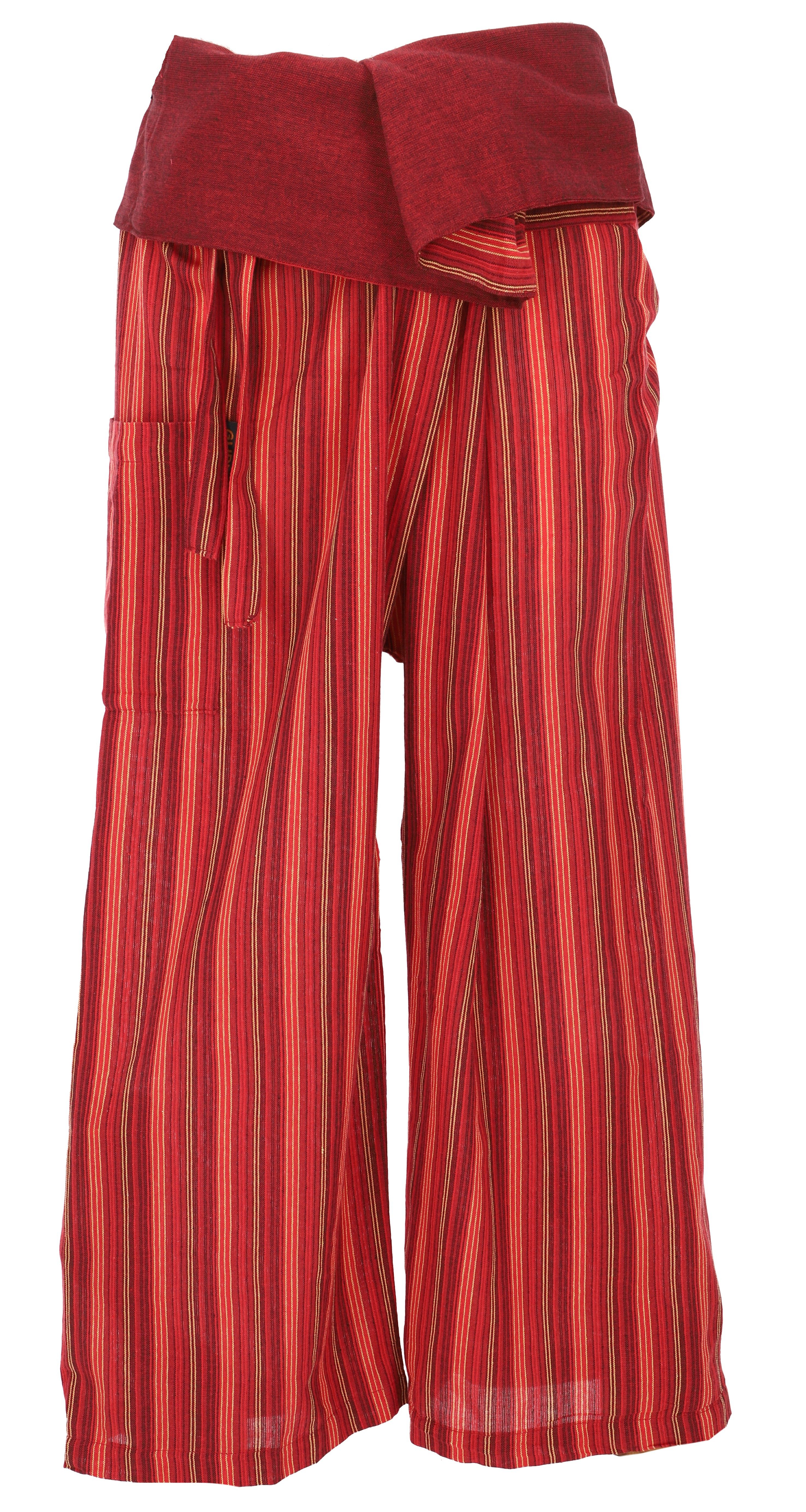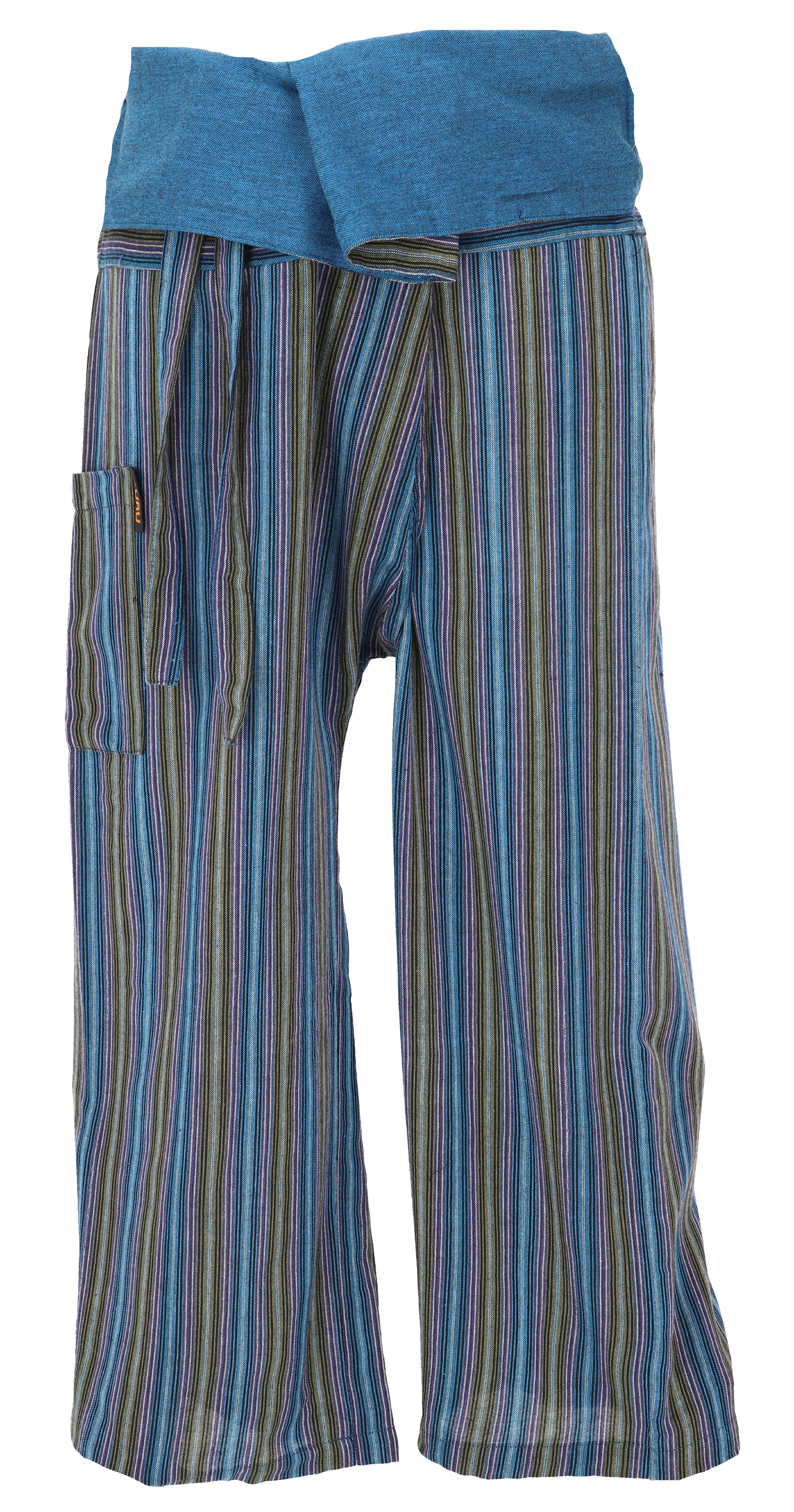 Die Fischerhose im Thai-Style ist aus einer etwas festeren Baumwolle und hat ein klein wenig schmaleres Bein, als die Thailändische. Seit Jahren steht sie geschätzt und gleichberechtigt neben dem thailändischen Vorbild in unserem Меню. Die Длина der Hose lässt sich durch die Breite des Bundumschlages variieren. Breiter Umschlag verkürzt, kurzer Umschlag verlängert das Hosenbein. Die Hose ist dementsprechend von einer Körperlänge von 165 bis 190 cm gut zu tragen. Die Weite kann ebenso durch die Breite des Einschlagens reguliert werden und ist bequem bis zu einem Umfang von 120 cm tragbar. Es gibt eine praktische aufgesetzte Hosentasche. Bekannt auch als Thai Shaolin Hose oder Thai-Fisherpant, lassen wir diese Wickelhosen in Nepal aus einem besonders angenehmen Baumwollstoff fertigen. Traditionell werden die Hosen bis leicht über den Knöchel getragen. Jede Hose ist in einer kleinen Baumwolltasche verpackt, auf der es eine Anleitung zum Wickeln gibt.