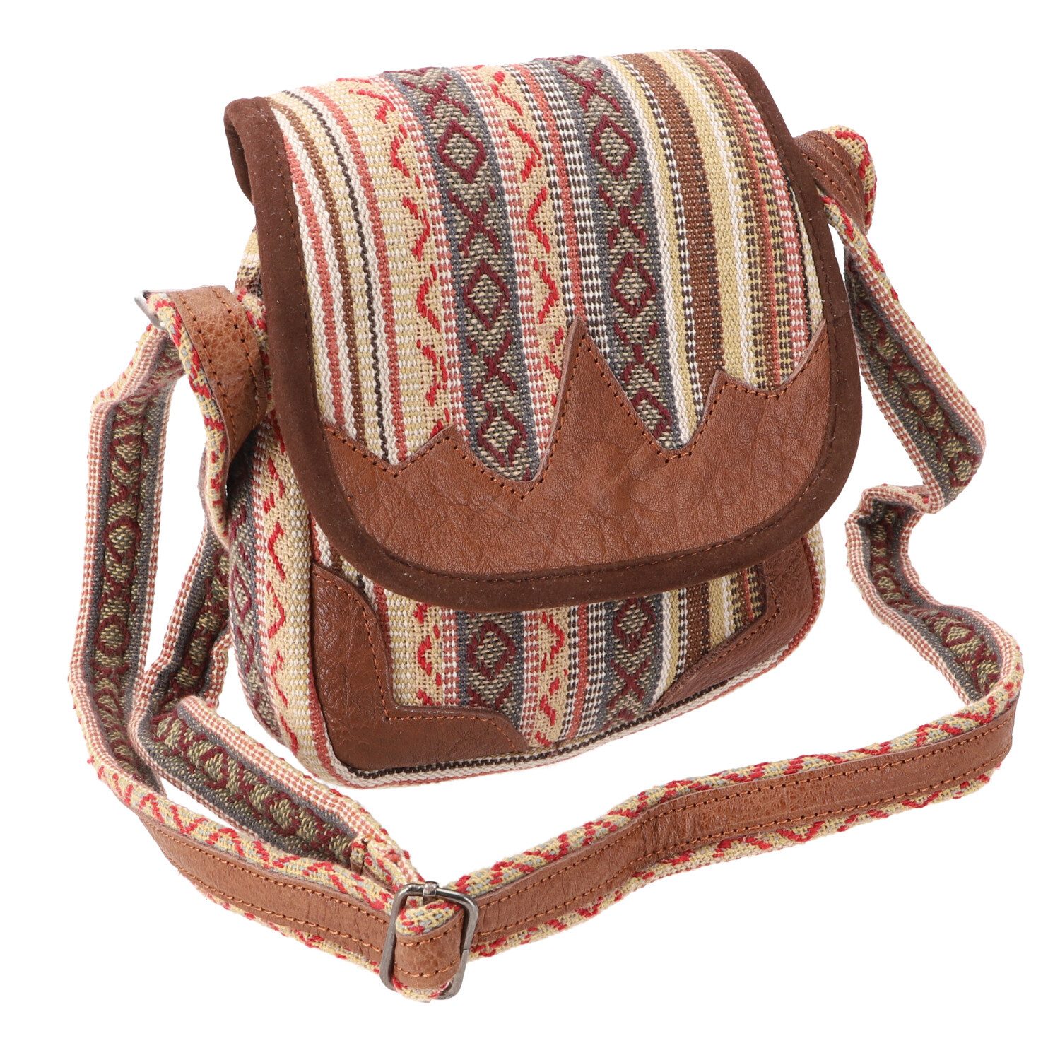 Kleine Ethno Schultertasche mit Leder, Nepaltasche - braun/braun | 20*17*5 cm