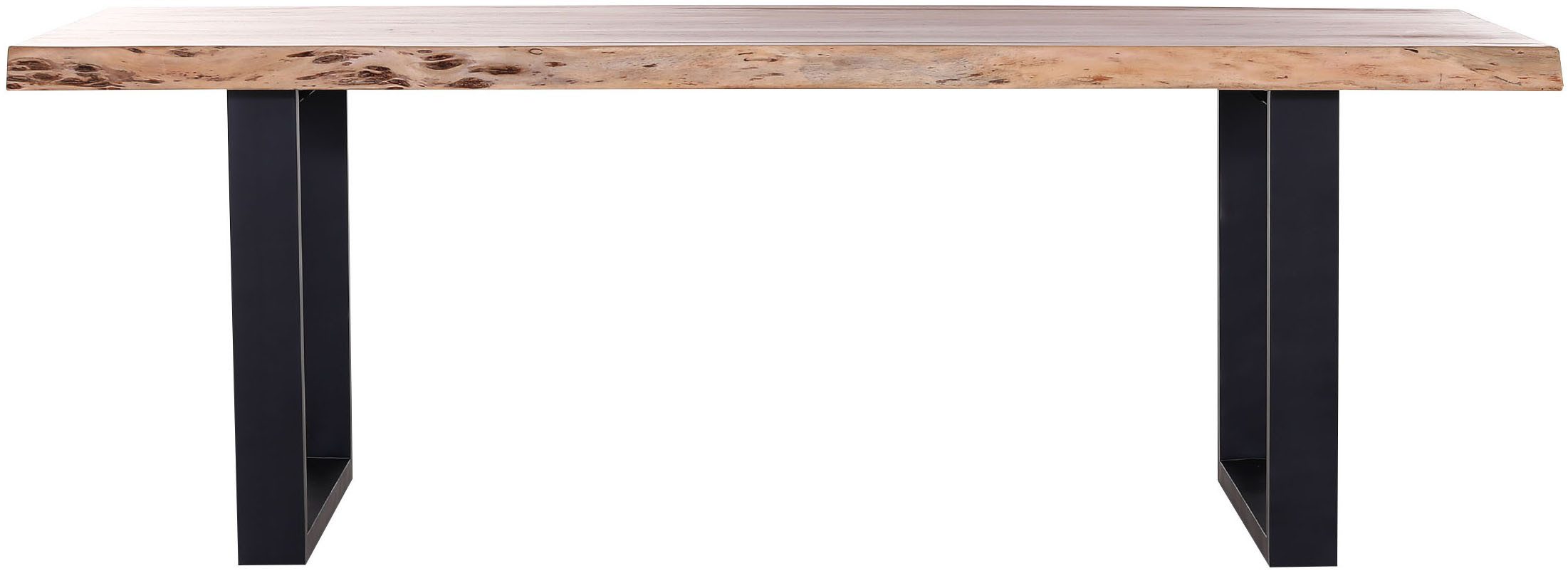 Ein Ort der Gastfreundschaft und des Beisammenseins — an diesem Esstisch von Gutmann Factory steht einer gemütlichen Zeit nichts im Weg. Durch das U-Gestell können Stühle in allen möglichen Richtungen und Positionen verschoben werden, ohne anzustoßen. Die individuelle Maserung macht das Massivholz unverwechselbar und verleiht der Optik ihren Charme.