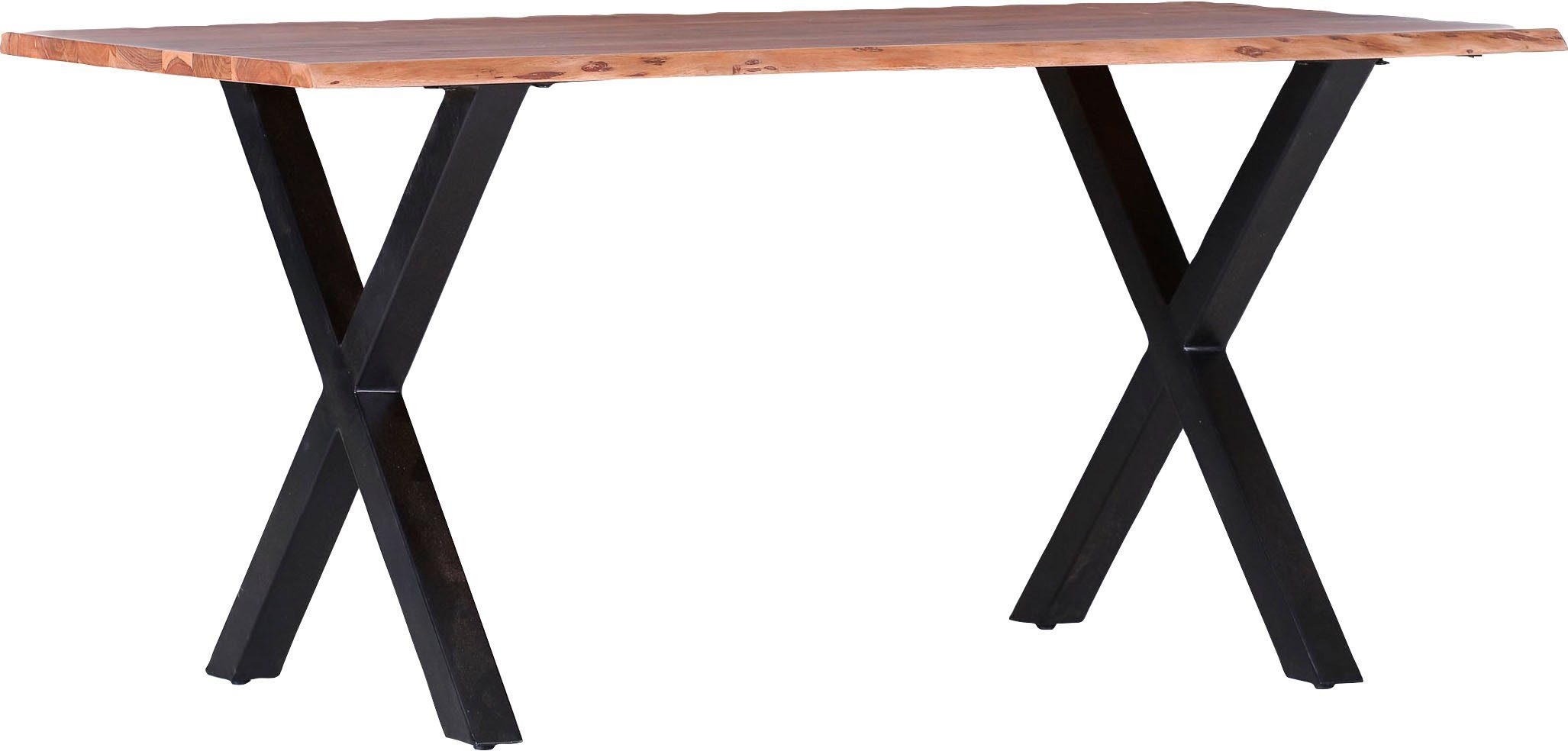 Im trendigen Industriestil präsentiert sich der kantige Esstisch »Tensio« aus der Kollektion von Gutmann Factory. Er schafft ein modernes Ambiente in deinem Wohn- und Essbereich. Dafür zeichnet seine attraktive Materialkombination aus Holz und Metall verantwortlich. Dabei wirkt die ausdrucksvolle Tischplatte aus Massivholz mit echter Baumkante als Blickfang. Sie weist natürliche Unregelmäßigkeiten auf, die das rustikale Erscheinungsbild des Esszimmermöbels unterstreichen. Für das gewisse Etwas sorgt das x-förmige Blockgestell aus pulverbeschichtetem Metall. Es verleiht dem Tischmöbel auch optisch Stabilität. Es zeichnet sich durch eine hohe Materialgüte und Verarbeitungsqualität aus. Dank der schützenden Oberflächenbehandlung profitierst du von einem geringen Pflegeaufwand. Überzeugt durch Design und wertige Optik: der kantige Esstisch »Tensio« von Gutmann Factory.