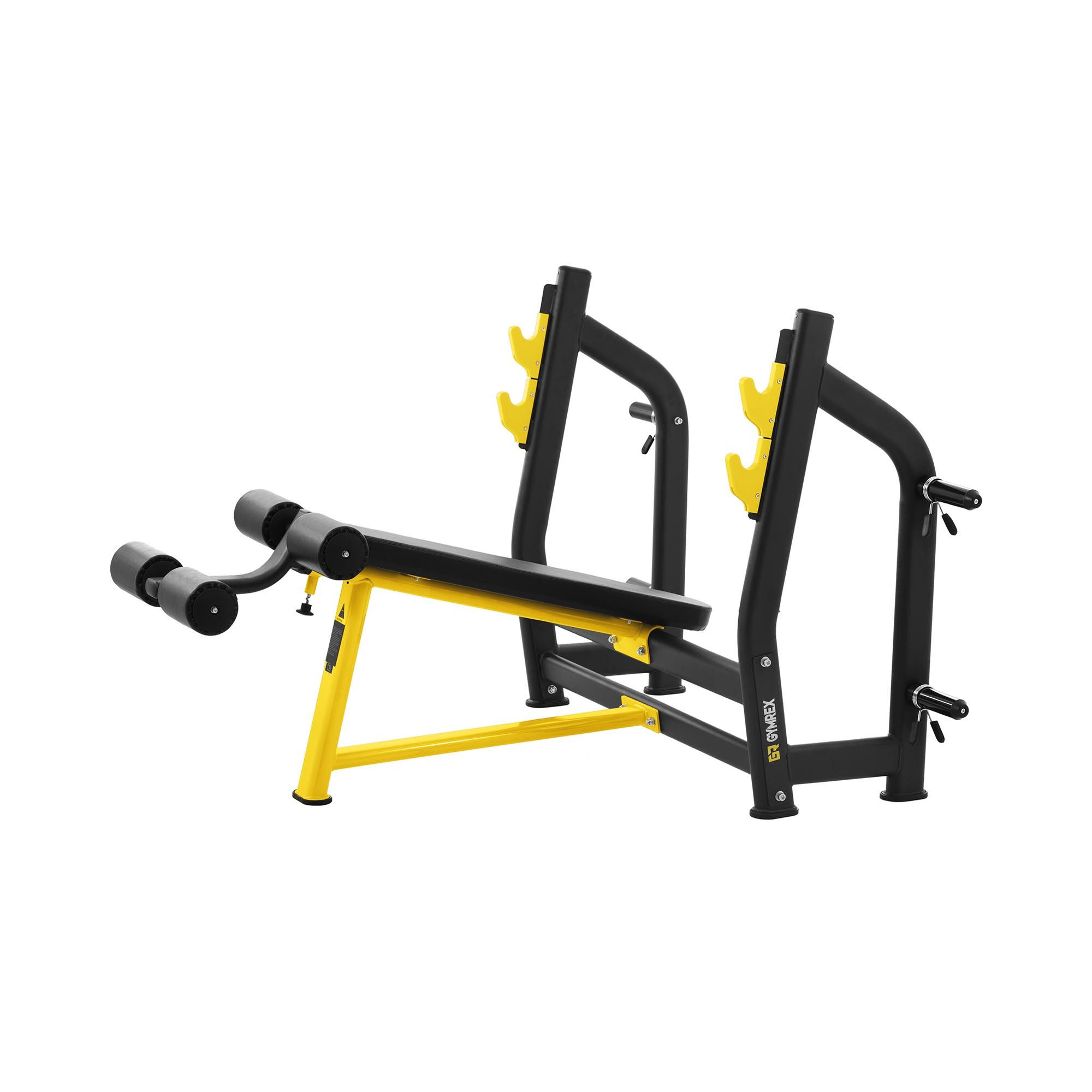 Die Sitzfläche der Hantelbank ist aus mit Leder gepolstertem Schaumstoff, sodass das Gesäß während des Trainings komfortabel abgelegt werden kann. Dank Stahl und der Farbkombination aus Schwarz und Gelb hat die negative Hantelbank den optimalen Gym-Look und eignet sich für jede Art von Fitnessstudio oder Home Gym.