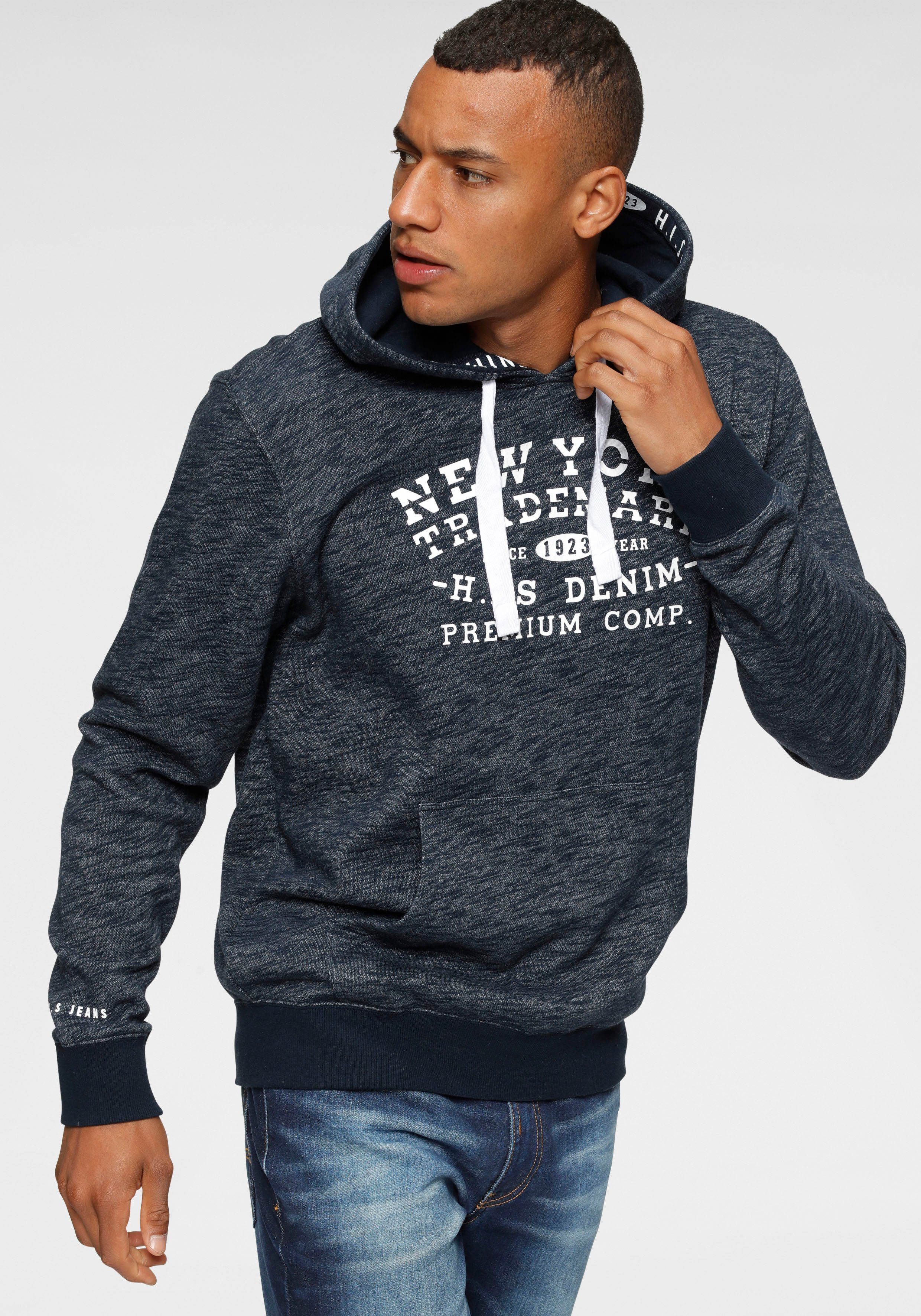 Das Kapuzensweatshirt von H.I.S eignet sich zum Chillen und auch beim Mittagessen mit Familie und Freunden. Mit dem Print sieht es sowohl locker als auch frisch aus. Die langen Ärmel enden in einem Rippbündchen, das für guten Sitz sorgt. Die am Bauch aufgenähte Kängurutasche bietet Platz, um die Hände zu wärmen und macht den bequemen Hoodie-Look komplett.