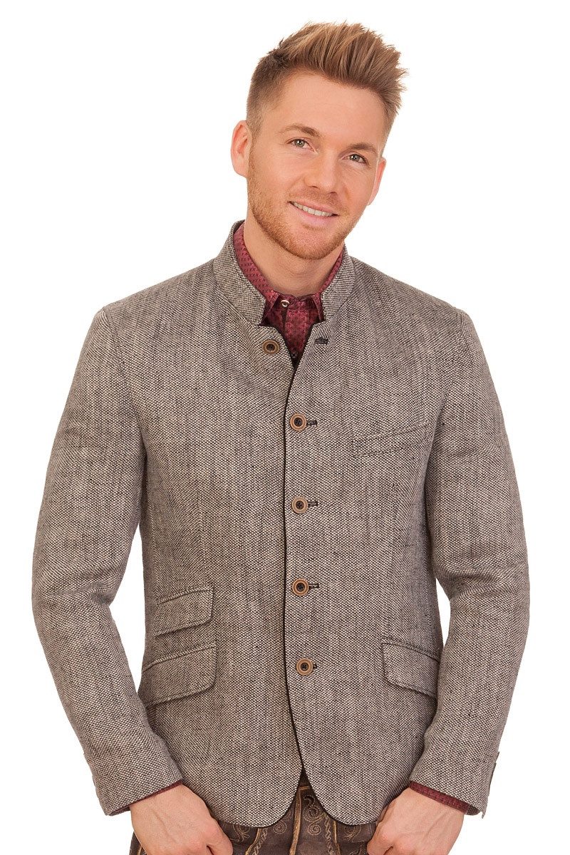 Der edle Herrenjanker Hinterglemm mit Stehkragen besteht aus reinem Leinen im Tweed-Look in "Salz und Pfeffer"-Art und ist leicht tailliert geschnitten. Vorn verfügt die Trachtenjacke mit Stil aus dem Hause h.moser auf der linken Seite über eine Brust- sowie Seitentasche, auf der rechten Seite befinden sich zwei übereinander liegende Seitentaschen. Die Seitentaschen sind mit einer Paspel und einer Taschenklappe als Pattentaschen gearbeitet. Große, rustikale Knöpfe in Holz-Optik zieren die Knopfleiste, kleinere Knöpfe im Holz-Stil die Ärmelbündchen. Sowohl an der Knopfleiste als auch an der Knopflochleiste gibt es eine Kontrastkante. Rückseitig zeigt sich der Janker durch den mittigen, überlappenden Rückenschlitz in der amerikanischen Варианты. Der Nacken- und Vorderbereich ist mit glänzendem Stoff mit zartem Rauten-Muster gefüttert; die Ärmel sind ebenfalls gefüttert. Links und rechts gibt es je eine Innentasche. Die klassische Herren Jacke bietet einen super Tragekomfort, passt zu jedem Anlass und ist auch in Übergrößen 56 - 62 erhältlich. Bitte beachten Sie die Übergrößenzuschläge.