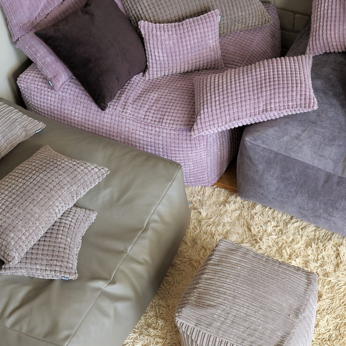 Die Hocker der Serie Corduroy Cord schaffen mit ihrer weichen und kuscheligen Haptik sofort ein gemütliches Wohnambiente und lassen sich perfekt kombinieren. Ein Beispiel sind die Kissen der Serie Nobile Samt