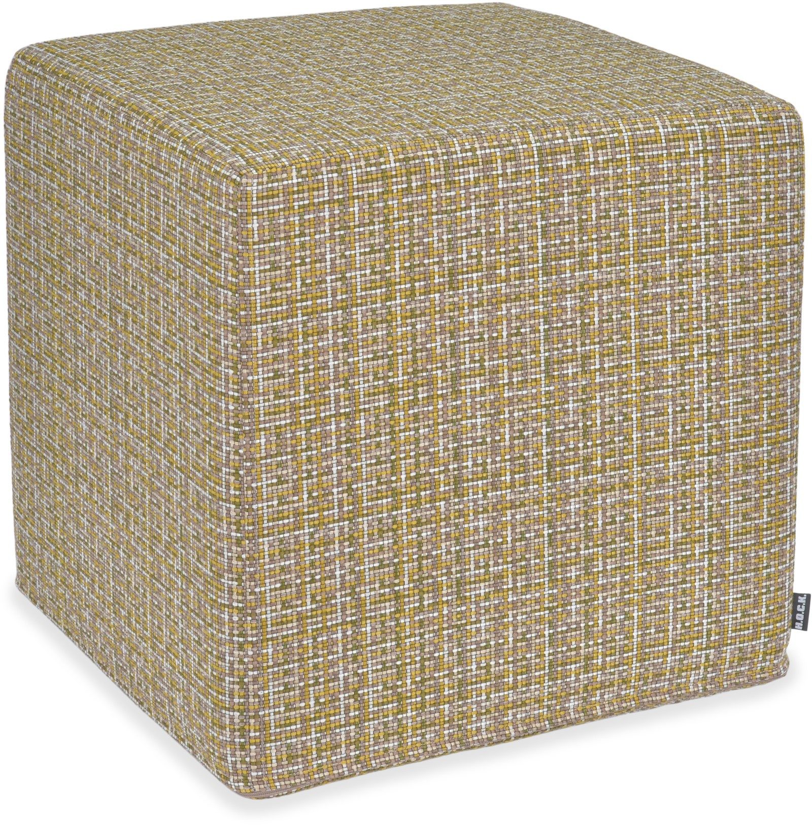 Der eckige Hocker "Mosaico" in der Размер 45x45x45cm überzeugt mit seinem kleingemusterten Karodesign in den lebhaften Farben Gelb und Olivgrün.