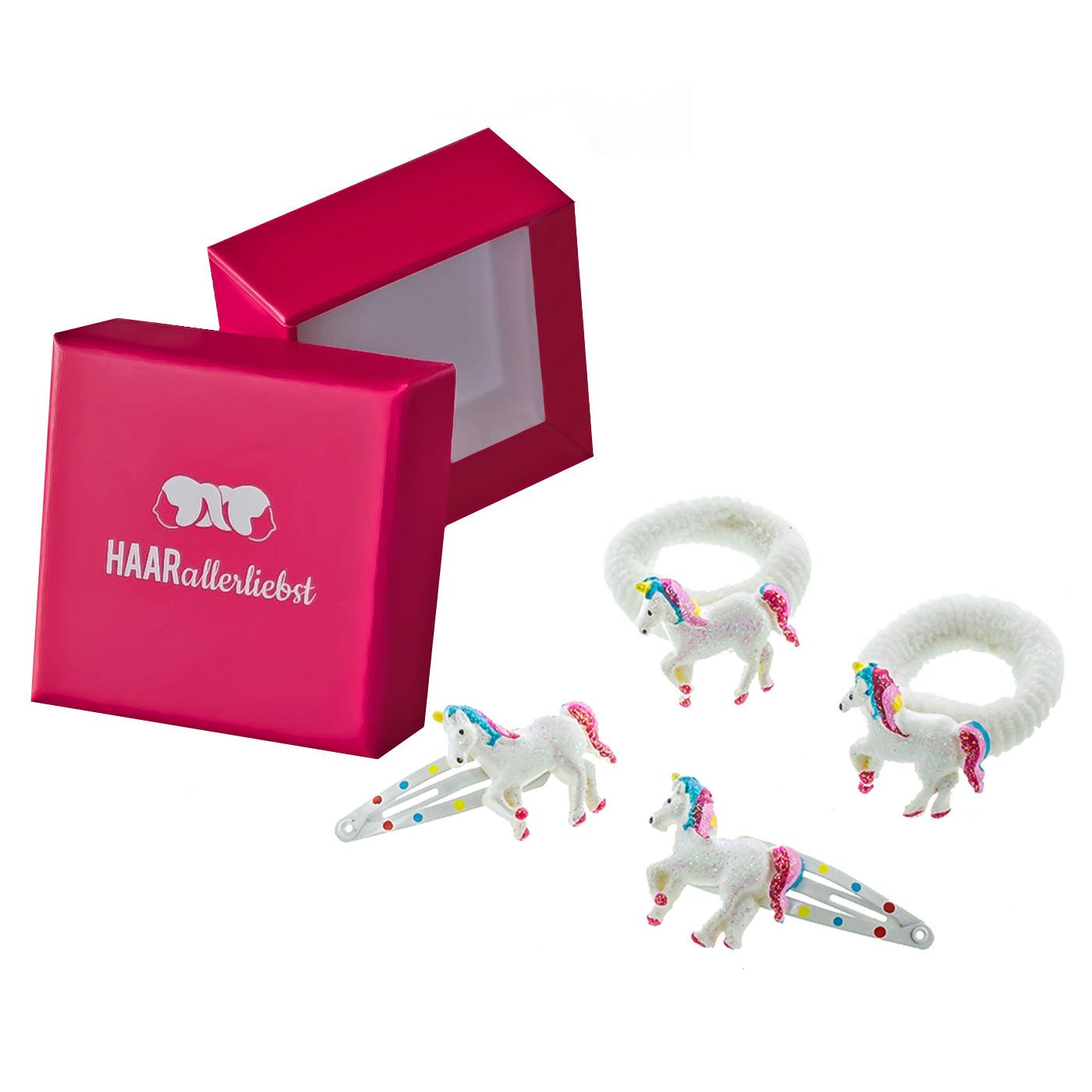 EINHORN HAARSPANGEUND HAARGUMMI SET MIT GLITZERNDEN EINHÖRNERN, 4-TEILIG, IN WEISS