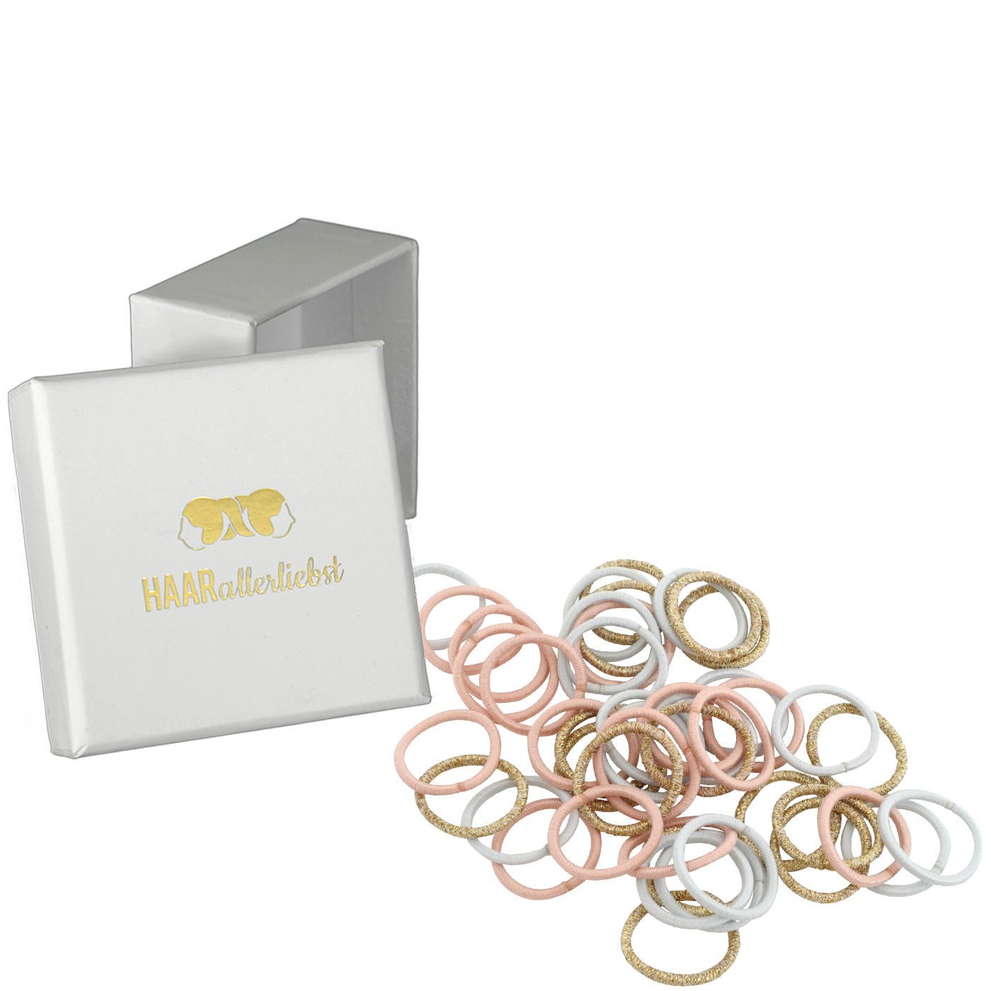 KLEINE HAARGUMMIS, 45 STÜCK, 2CM DURCHMESSER, IN ROSA, HELLBLAU UND GOLD