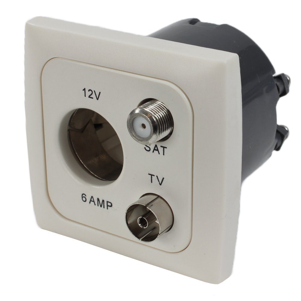 C-Line 12 Volt Steckdose mit Sat und TV Anschlüssen, Abdeckrahmen und Berührungsschutzdose in weiß