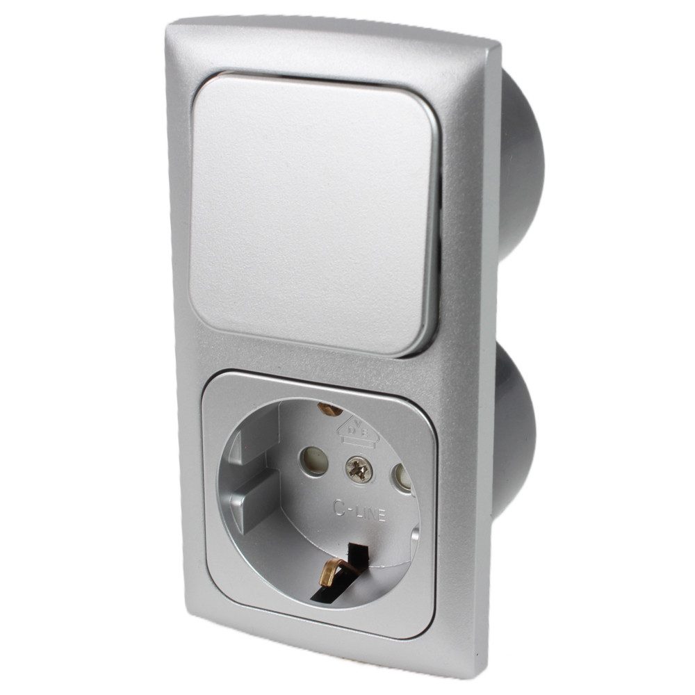C-Line 230 Volt Schuko Steckdose mit Schalter, Abdeckrahmen und Berührungsschutzdose in silber