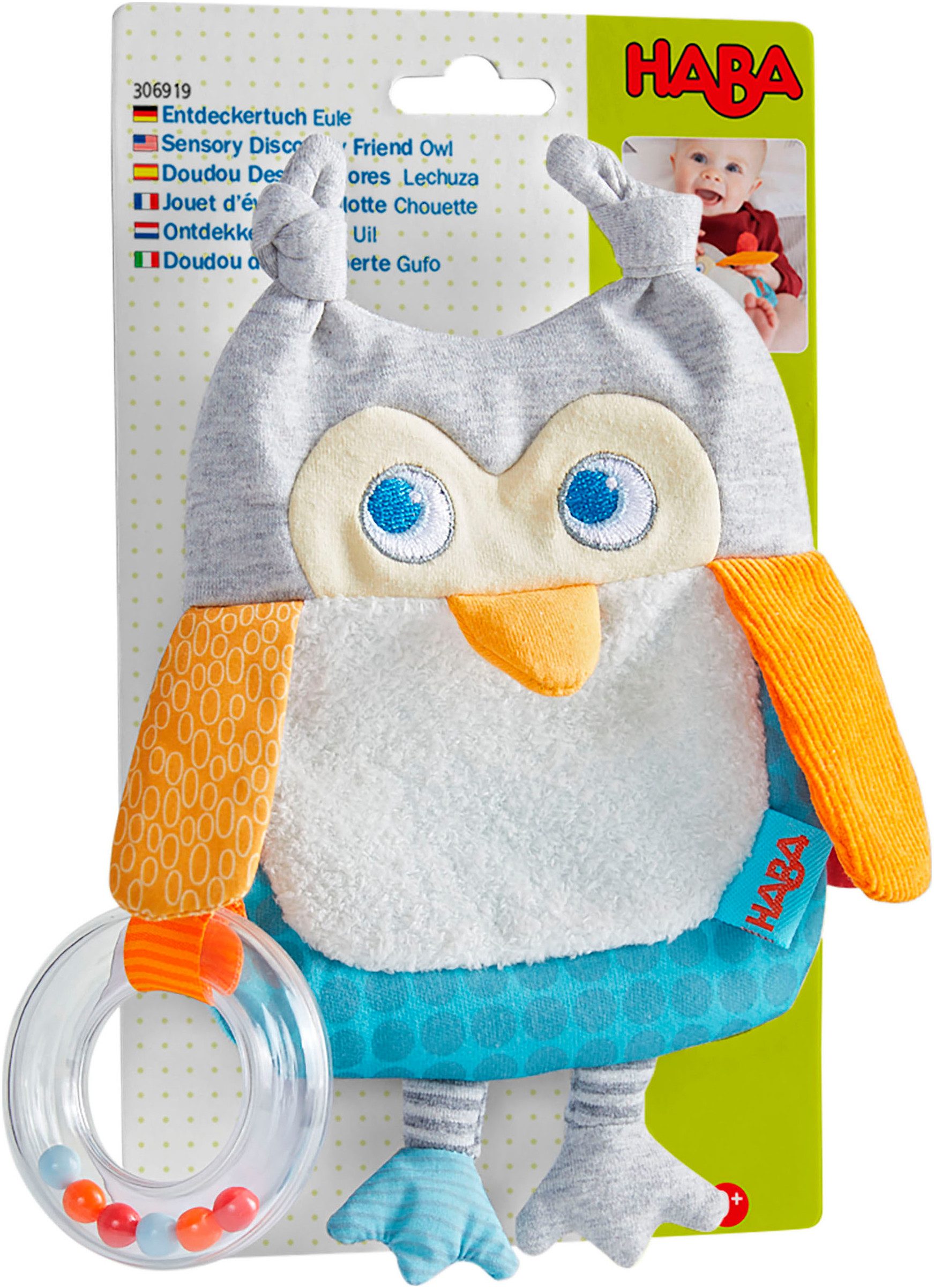 Keinesfalls nachtaktiv ist die niedliche Eule, aber vieles zugleich: Babys Spielkameradin mit Knistereffekt, Trösterin und eine nützliche Helferin. Denn in ihrem Bauch lässt sich ganz einfach ein Wärme- oder Kühlkissen mit den Maßen 12 x 12 cm verstecken. Die unterschiedlichen Spielelemente animieren dabei zum Schauen, Fühlen und Greifen und sorgen für Babys Unterhaltung und stetigen Spielspaß.