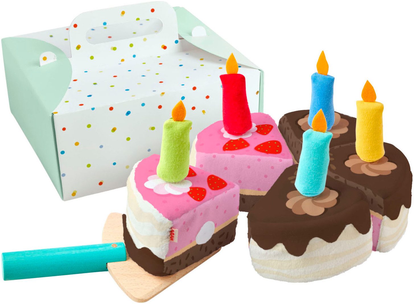 Inklusive 5 Kerzen und Holz-Tortenheber für realitätsnahes Spiel