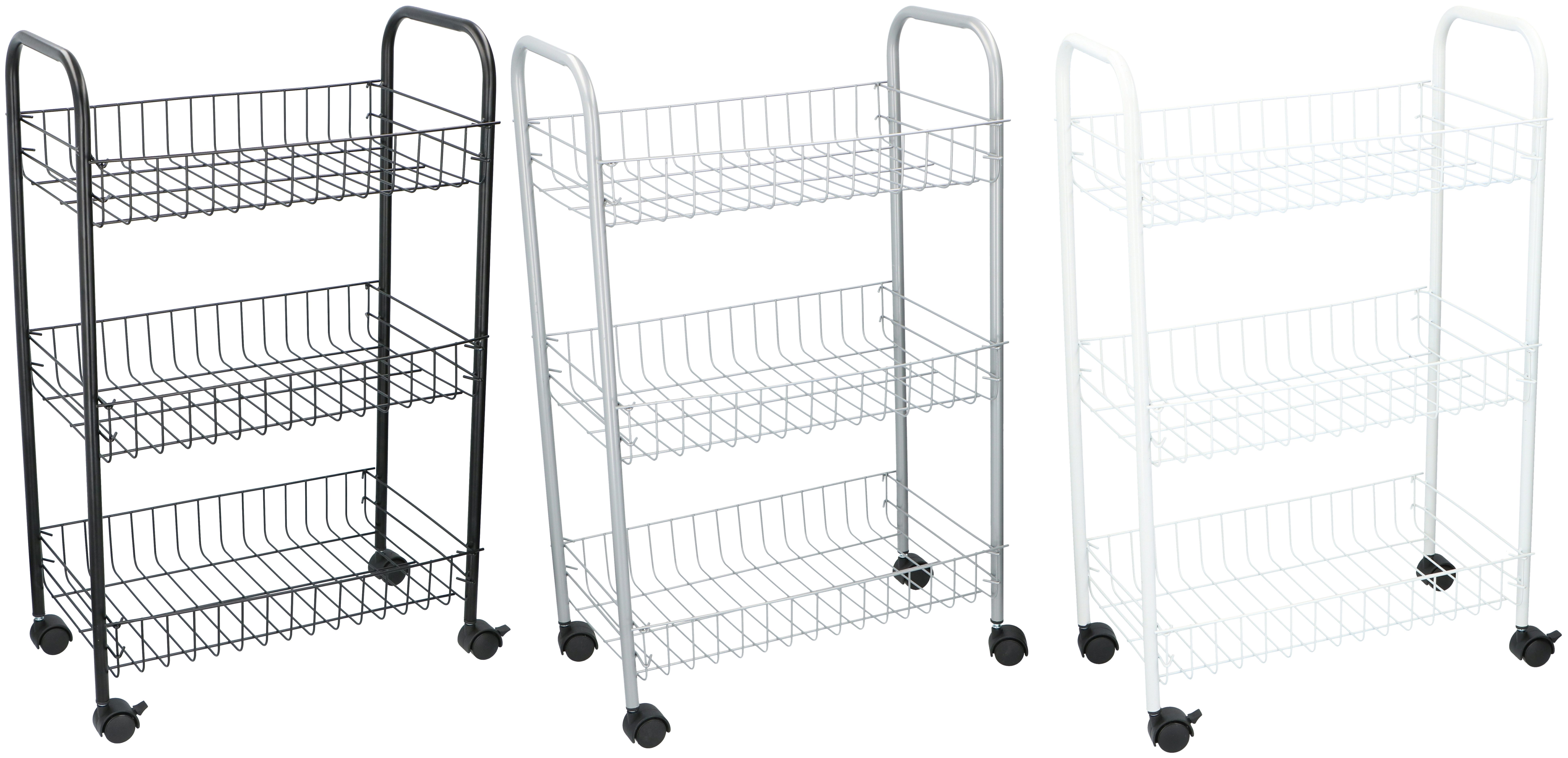 Dieser praktische Rollwagen mit drei geräumigen Körben ist die perfekte Lösung für Ihre Aufbewahrungsbedürfnisse. Mit einer Höhe von 40 cm bietet er optimalen Zugriff auf alle Ebenen. Der Wagen ist aus hochwertigem, pulverbeschichtetem Stahl gefertigt, was ihm Stabilität und Langlebigkeit verleiht. Trotz seiner robusten Konstruktion wiegt er nur 1,5 kg und lässt sich dank der vier Lenkrollen mühelos bewegen. Besonders praktisch: Все Rollen sind mit Feststellbremsen ausgestattet, sodass der Wagen sicher an Ort und Stelle bleibt, wenn Sie es wünschen. Die drei Drahtkörbe bieten großzügigen Stauraum für Obst, Gemüse, Haushaltsutensilien oder andere Gegenstände. Die offene Drahtkorb-Konstruktion ermöglicht dabei eine gute Übersicht über den Inhalt und gewährleistet optimale Luftzirkulation. Ein vielseitiger Helfer für Küche, Vorratsraum oder Büro.