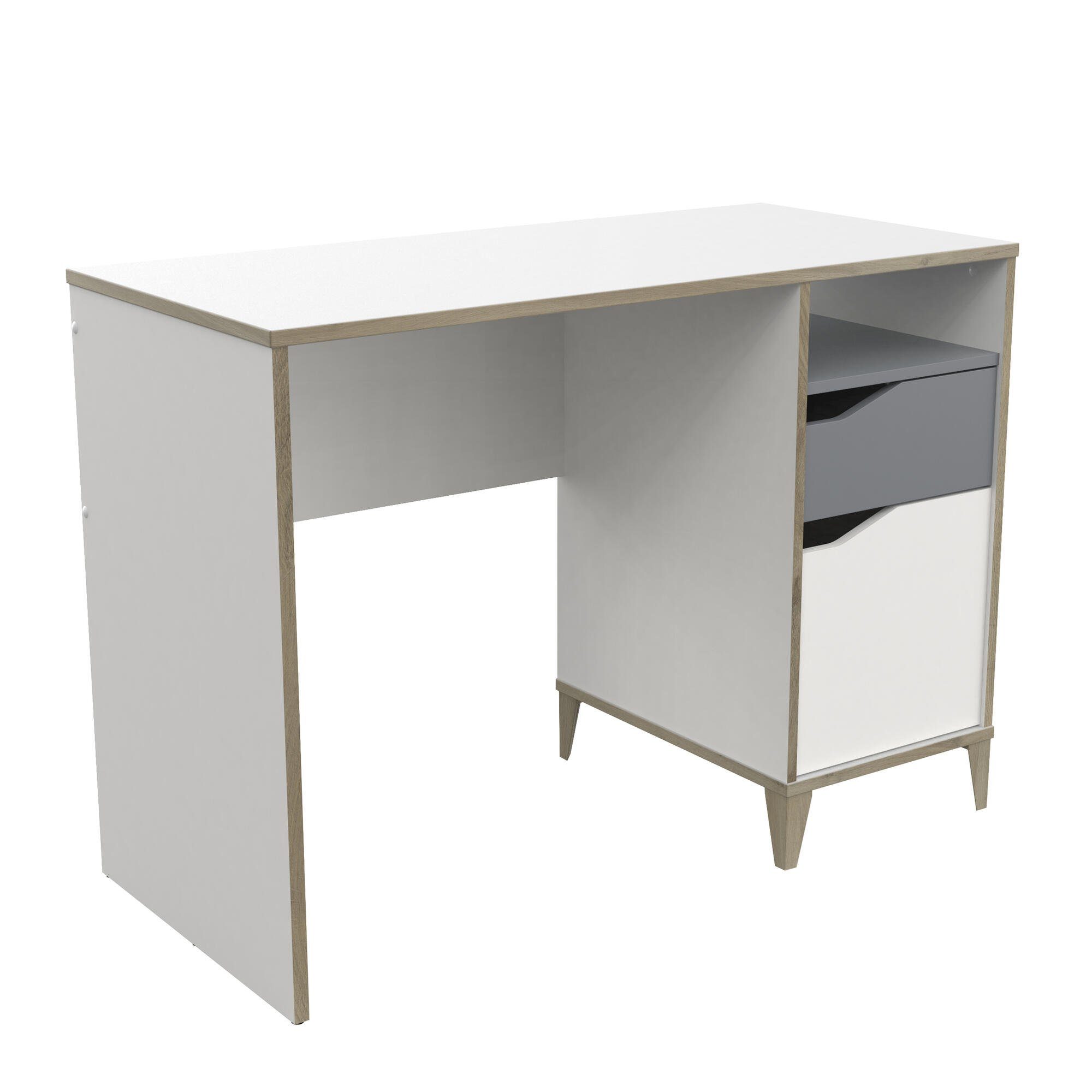 Mit diesem Schreibtisch holen Sie sich nicht nur ein Möbelstück, sondern ein echtes Wohlfühlelement in Ihr Zuhause! Im trendigen skandinavischen Stil überzeugt er durch seine klaren Linien, die konisch geformten Füße und das harmonische Zusammenspiel aus zeitlosem Weiß und edlem Graphitgrau. Maße & Materialien: Mit einer großzügigen Длина von ca. 106,6 cm, einer Tiefe von ca. 50 cm und einer Höhe von ca. 76,4 cm bietet dieser Schreibtisch genau die richtige Fläche für kreatives Arbeiten und konzentriertes Lernen. Die robusten Platten sind 15 mm bzw. 18 mm stark, melaminbeschichtet und pflegeleicht – für langanhaltende Freude und einen stilvollen Look. Durchdachter Stauraum & Funktionalität: Ein Unterschrank mit flexiblen Stauraumkombinationen lässt keine Wünsche offen: Schublade auf leichtlaufenden Rollen, Ablagefächer und eine Tür schaffen Platz für Hefte, Ordner, Stifte und vieles mehr. Ergonomische Griffaussparungen machen das Öffnen besonders angenehm. Für einen aufgeräumten Arbeitsplatz sorgt zudem die praktische Kabeldurchführung auf der Rückseite – ideal für Laptop, PC oder Schreibtischlampe. Zeitlos kombinierbar & vielseitig einsetzbar: Ob im Jugendzimmer, Home-Office oder Arbeitsbereich – das Design mit den charakteristischen Füßen und der eleganten Farbkombination fügt sich harmonisch in verschiedenste Einrichtungsstile ein und bleibt trotzdem ein echter Hingucker. Verleihen Sie Ihrem Arbeitszimmer einen Hauch nordischer Leichtigkeit und entdecken Sie jetzt, wie stilvoll Organisation sein kann!