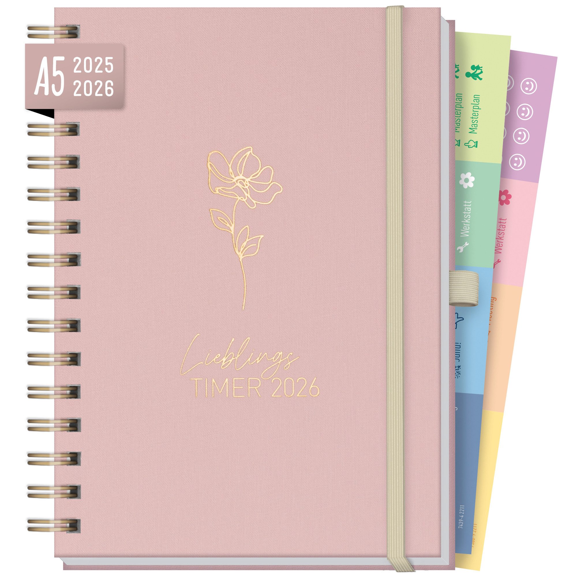 Lieblings-Timer Deluxe von August 2025 bis Dezember 2026 mit 1 Woche auf 2 Seiten. DELUXE-KOMFORT: Gummiband, Stifthalter, Lesezeichen, Sticker, Einstecktasche für lose Zettel!