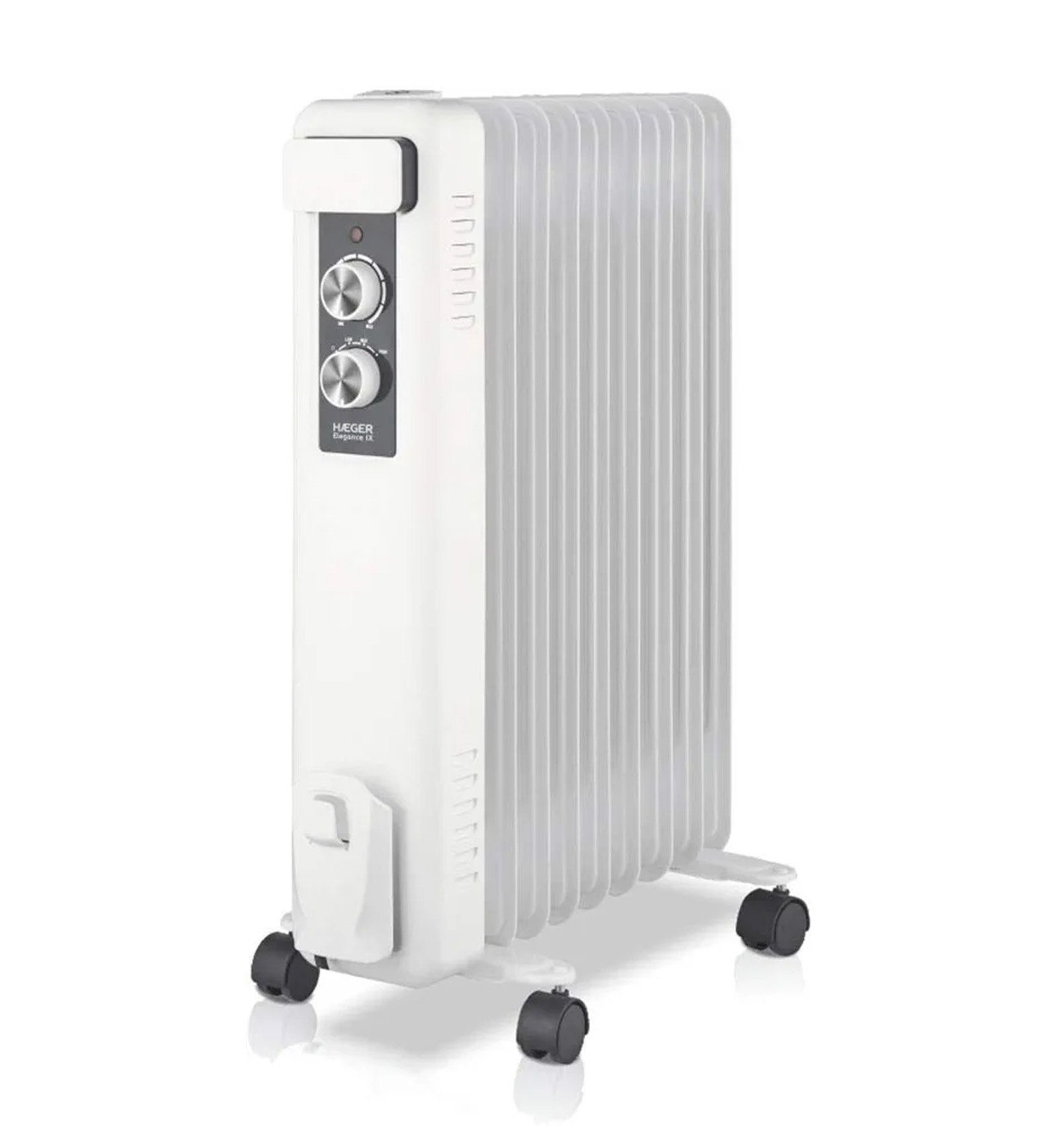 Elektrischer Ölradiator mit 9 Lamellen, 5 Ölkanälen, 3 Heizstufen, auf Sicherheit druckgeprüft, einstellbarem Thermostat, leichtgängige Räder, Überhitzungsschutzsystem und Kabelaufbewahrung.