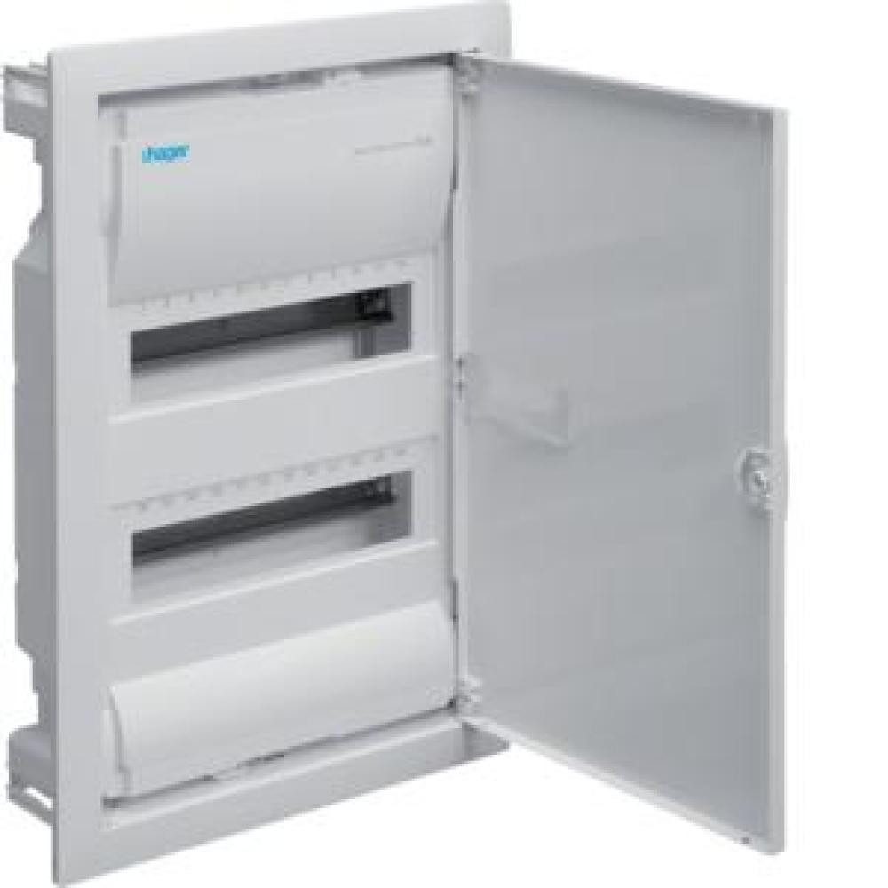 Kleinv.,Volta,UPV,2x12PLE,IP30,Tür. Installationskleinverteiler Unterputz aus Kunststoff, nach DIN VDE 60670-24 und DIN 43871, geeignet zum Einsatz in Wohngebäuden nach DIN 18015. Zum Einbau von Geräten bis 63 A mit 70 mm Einbautiefe nach Maßnorm DIN 43880, Bemessungsspannung 400V/50Hz. Schutzart IP30, Schutzklasse II schutzisoliert. Bestehend aus: Kunststoff-Mauerkasten mit serienmäßigem Leitungsabfang und ausbrechbaren Leitungseinführungsschiebern mit Schnappbefestigung, integrierter Wasserwaage und verzinkten Stahlblech-Befestigungslaschen. Geräteträger aus verzinktem Stahlblech, Hutschienen einzeln isoliert einbaubar. Geräteabdeckung aus Kunststoff mit 46 mm Geräteschlitz, Schnellverschlussbefestigung mit 90° Drehung, serienmäßig plombierbar. Verdrehbarer Blendrahmen mit Tür aus Stahlblech, pulverbeschichtet und eingebrannt, mit 15 mm Putzausgleich. Tür, frontbündig mit innenliegenden handbedienbaren Scharnieren. Türverschluss mit frontbündiger Griffmulde und selbsttätig zurückklappendem Griff, Türanschlag rechts oder links ohne Blendrahmendemontage. Serienmäßige Schaltplanbefestigung in der Tür und integrierter seitlicher Leitungsführungskanal mit Kabelhalteklammern. Fingersichere PE/N-Klemme mit Stecktechnik in montagefreundlicher Schnapptechnik und N-Klemme für FI-Kreise serienmäßig.