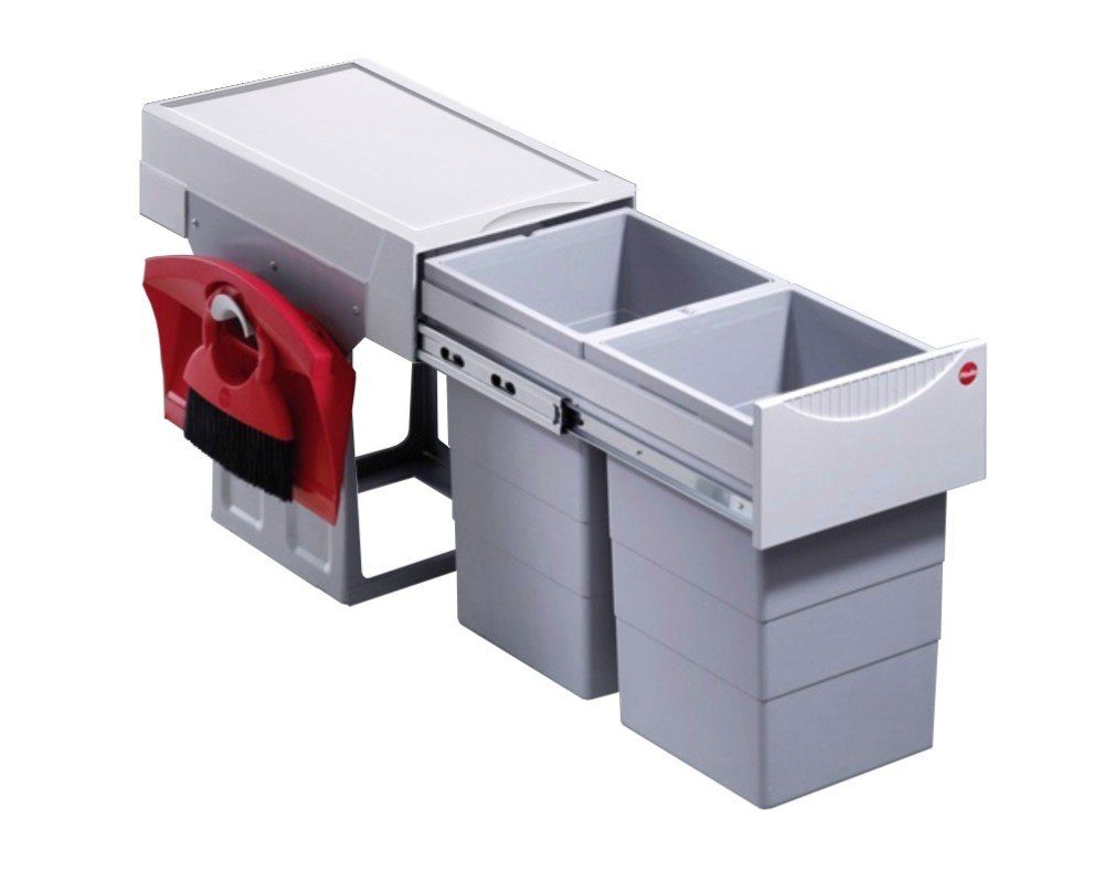 Der Hailo-Abfallsammler TA Swing 30.2/30 plus Tandem besitzt eine Unterteilung von 2x 15 Liter und ist ab 40 cm Unterschrankbreite einbaufähig. Per Hand kann der Mülleimer nach dem Öffnen der Schranktür heraus gezogen werden. Als Abdeckung für die Inneneimer sowie als Ablage, z.B. für Müllbeutel, findet der robuste Kunststoffdeckel Verwendung. Zusätzlichen Nutzen bietet das Kehrschaufelset, welches je nach Einbau, rechts oder links, am Abfalltrennsystem eingehängt werden kann.