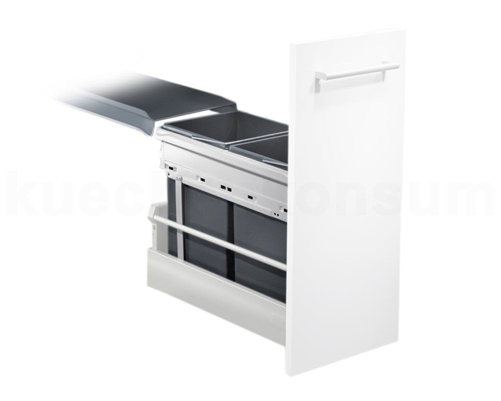 Dieser Abfallsammler von Hailo funktioniert in Verbindung mit einem 30 cm breiten Schubkastenauszug. Die Nutzung des Hailo Mülleimers setzt einen vorhandenen 30 cm Schubkastenauszug vorraus. In dem vorhandenem Schrankauszug wird das Rahmengestellt fest installiert, welches zwei 15 Liter Mülleimer aufnimmt. Beim Handling des Unterschrankauszug verbleibt der Deckel im Schrank und ermöglicht so das bequeme Befüllen der 2 Abfallbehälter von Oben. Zudem lassen sich die Eimer auch bequem, auf Grund ihrer vorhanden Metallhenkel, aus dem Rahmengestell entnehmen. Ebenso kann der robuste Kunststoffdeckel als zusätzliche Ablagefläche im Schrankinneren mitgenutz werden.