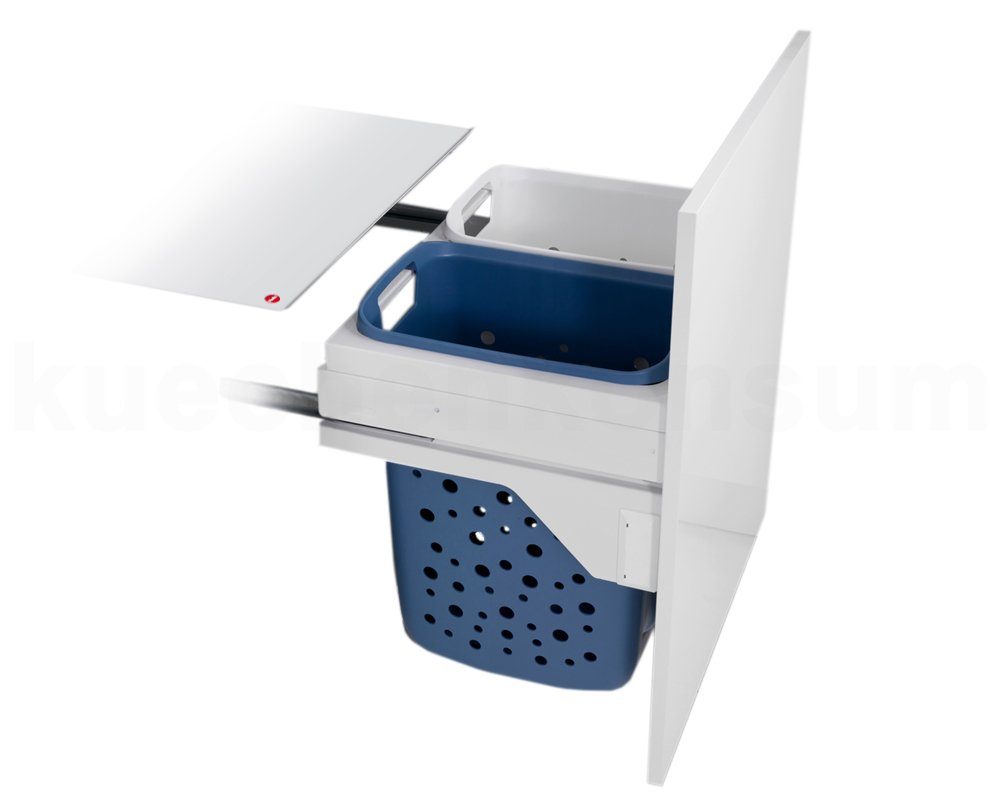 Der Hailo Laundry-Carrier ist speziell für 60 cm breite Schränke entwickelt wurden, bei denen im rückwertigen Bereich die Anschlusstechnik oder ein Spülenablauf die Nutzung der vollen Schranktiefe verhindert. Die beiden Wäschebehälter sind nebeneinander positioniert und können bequem von Oben befüllt werden. Eine große Griffausbildung ermöglicht die sichere Entnahme beider Kunststoffbehälter. Montiert wird der Auszug in einen vorhandenen Schrank mit ebenfalls vorhandener Tür.