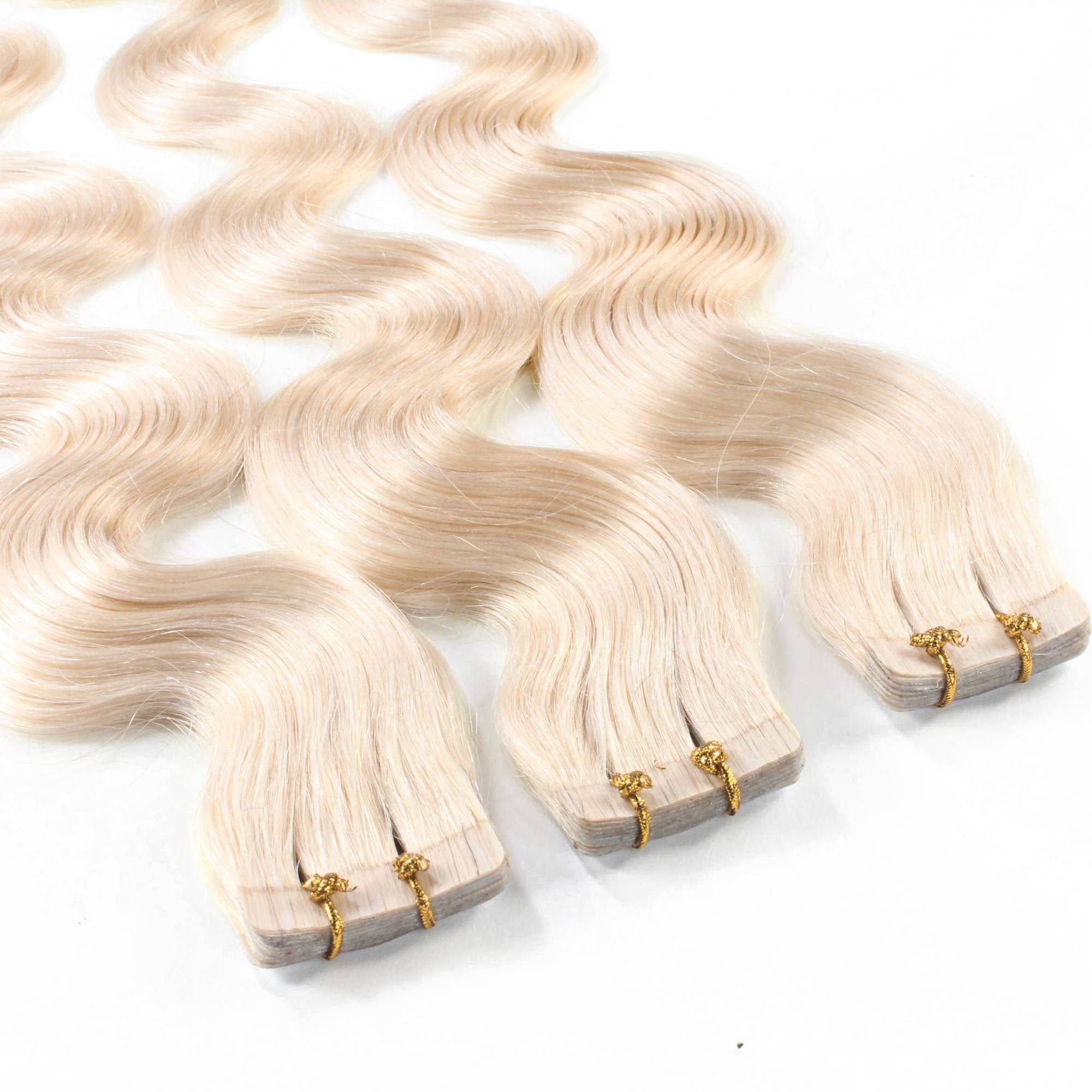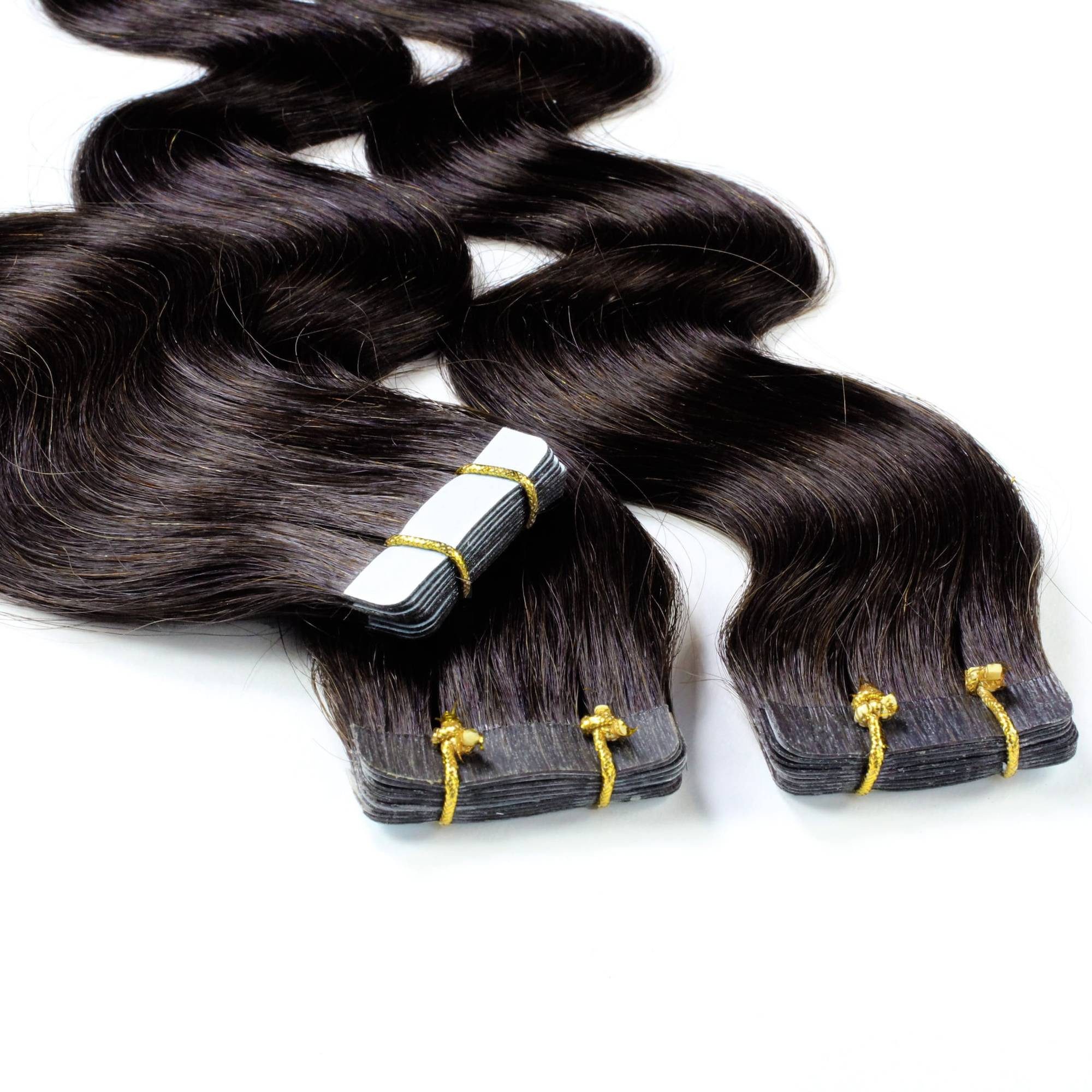 Tape in Extension Strähnen sind ca. 4cm breit, so werden in der Summe weniger, dafür jedoch breitere Strähnen eingesetzt als bei Bondings oder Microrings. Es beschleunigt auch das Anbringen und das Entfernen der Extensions.