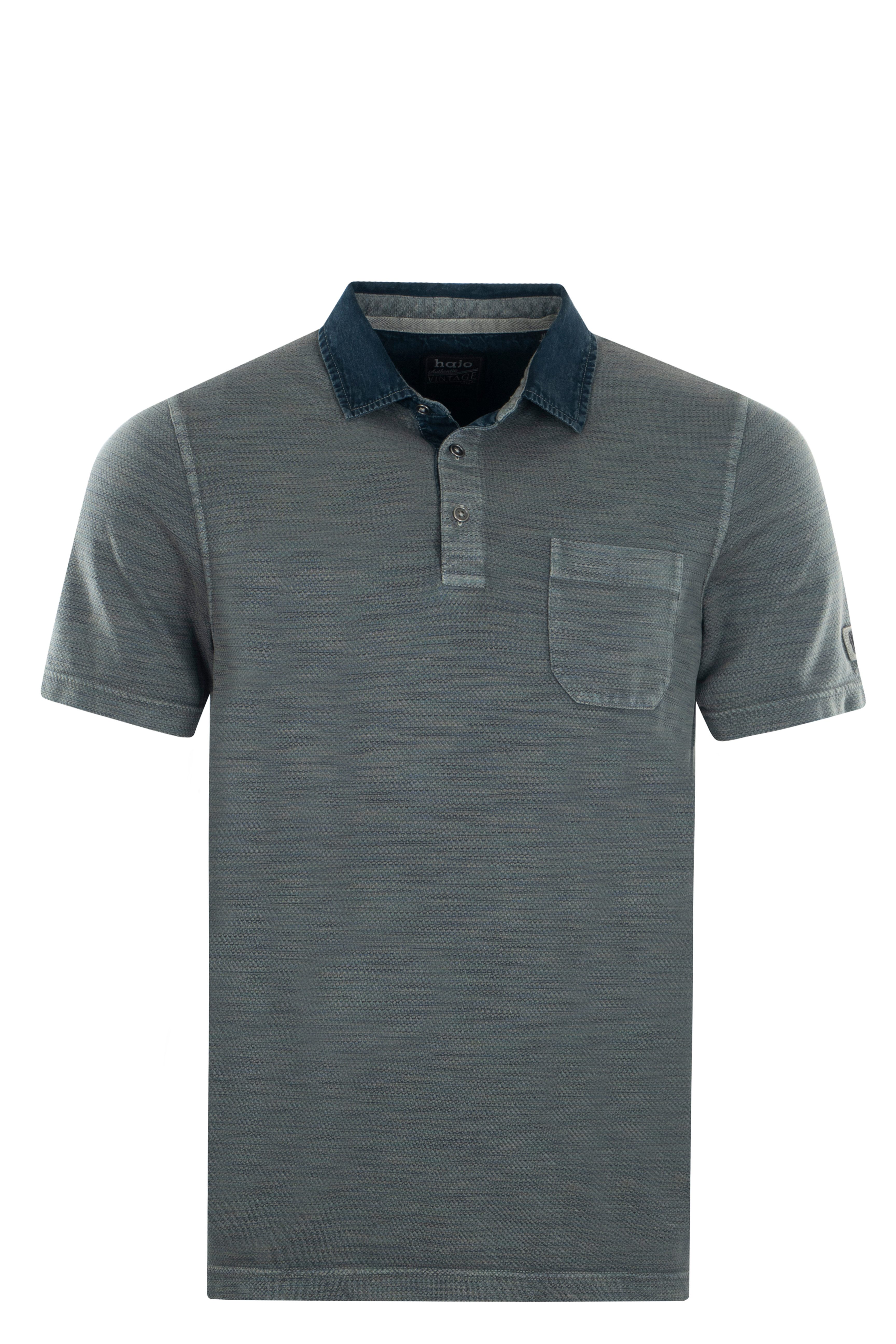 Poloshirt von "hajo". Flachstrickkragen in Jeans mit 3-er Knopfleiste, Popkornstruktur allover, Washer, offene aufgesetzte Brusttasche, offene Form mit Seitenschlitzen.
